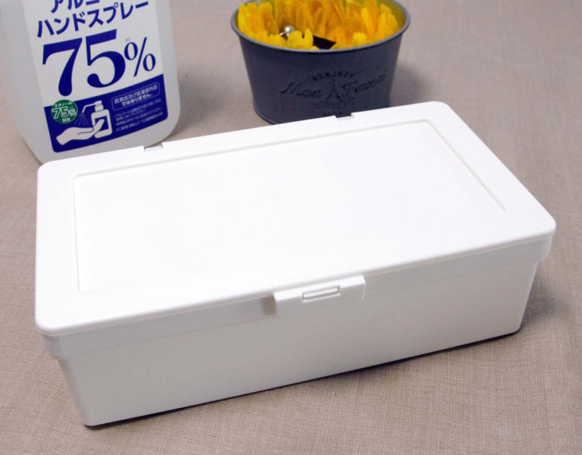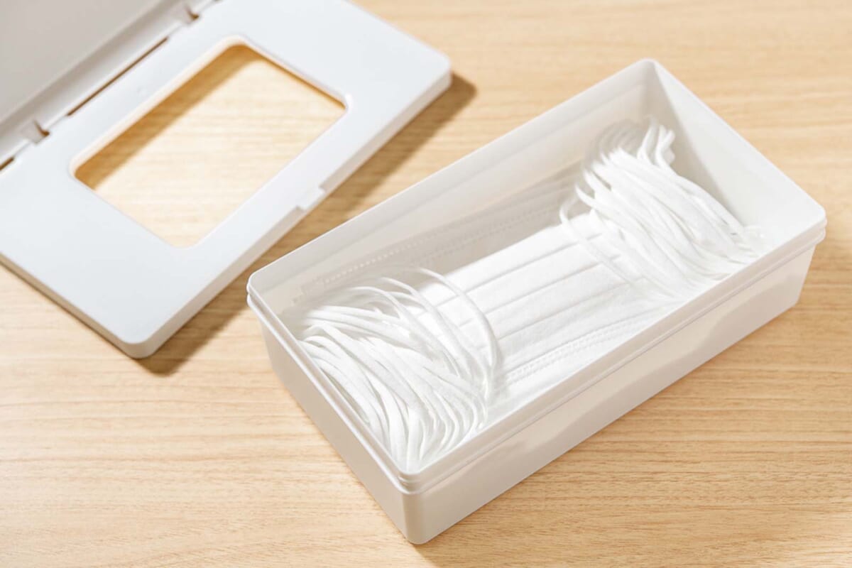 ふつうサイズの不織布マスクを約30枚保管できるケース。本体前面の取っ手を手前に引き出すと内フタが出現し、マスクを1枚ずつ容易に取り出すことができる。マスクの紙箱をそのまま置きたくない人にオススメ。
