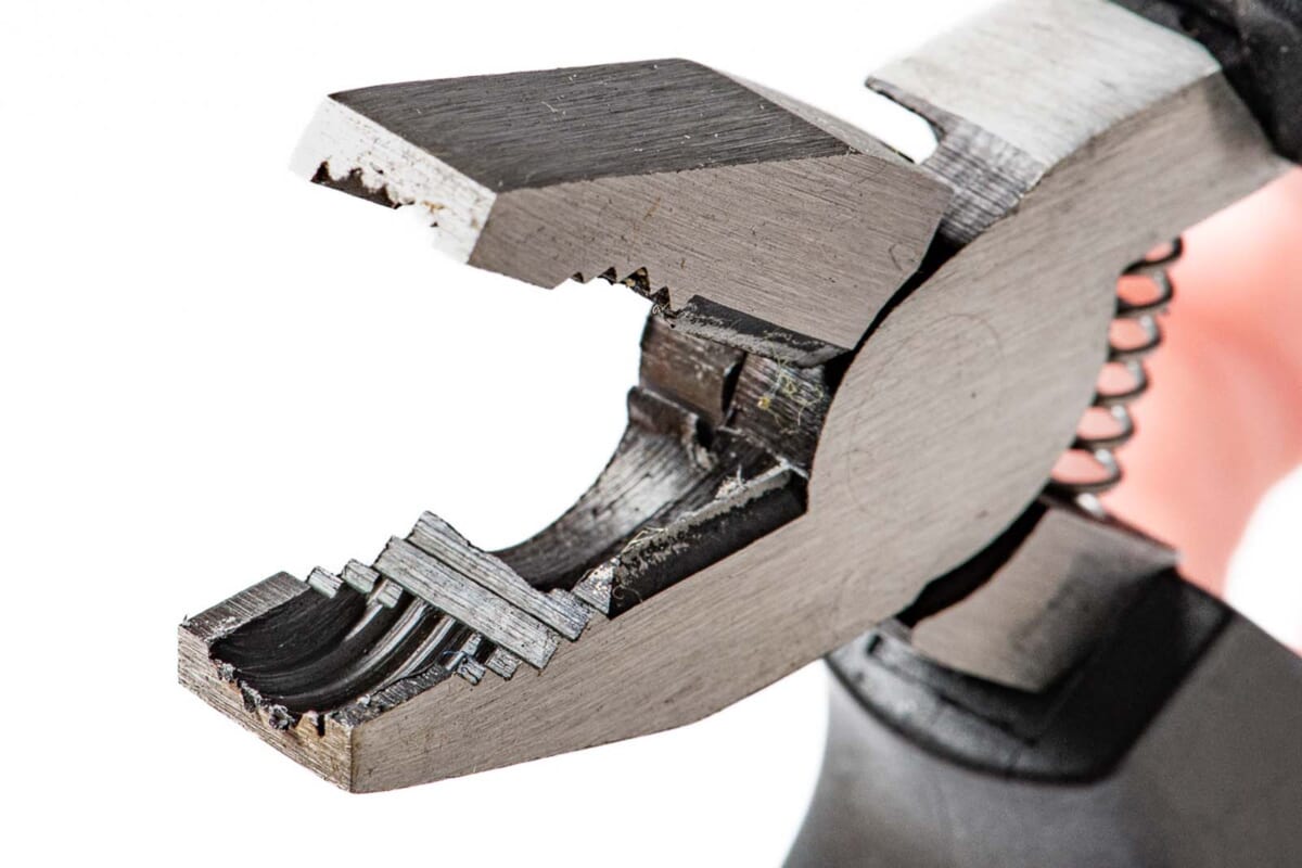 ペンチ先端に刻まれたギザギザがネジ頭をしっかりキャッチ。ネジ山が潰れてしまい回せなくなってしまったネジを緩められる。鉄線直径0.8mm以下、銅線直径1.2mm以下の金属線の切断能力もあり、通常のペンチ同様に使用できる。