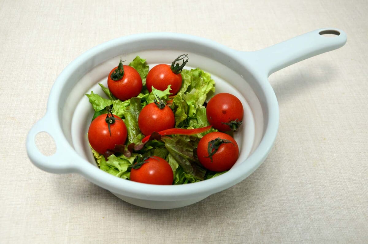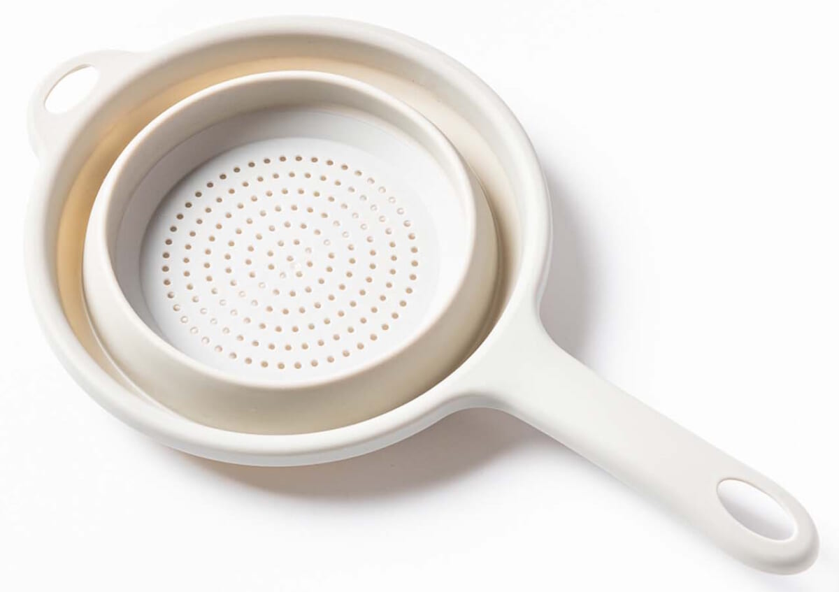 「食材の水洗いや水切りに便利なザルですが、いくつもあると収納場所に困ります。折りたためるタイプならコンパクトに収納でき、立ててもOK。省スペースです」