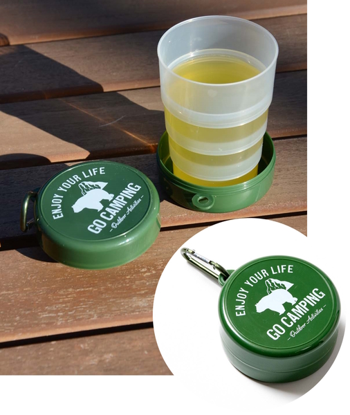 折りたたんでコンパクトに収納できるコップ。本体カバーを開けて収納された部分を引き出せば、容量200mlのコップになる。バックパックなどに提げられるカラビナ付きなのも便利だ。ただしコップ部の耐熱温度は60℃なので注意が必要。