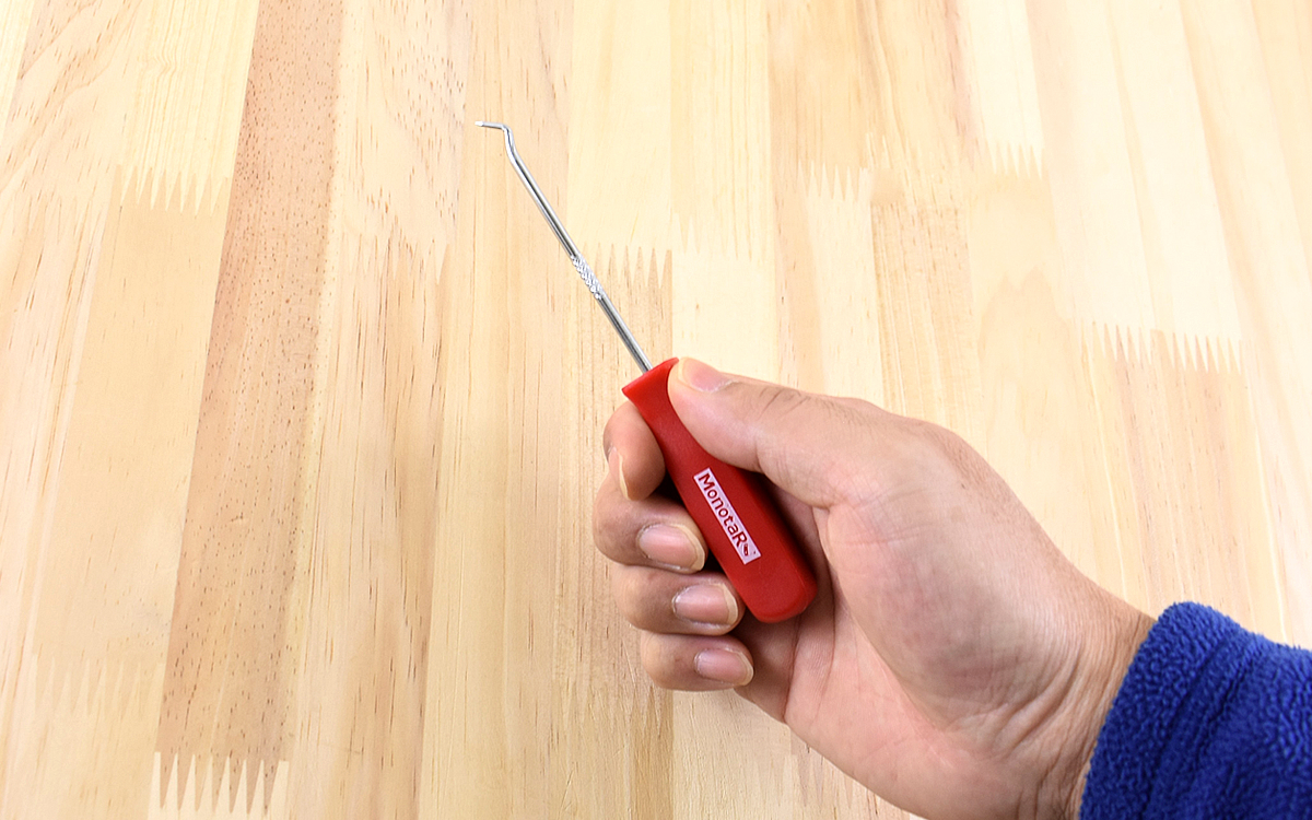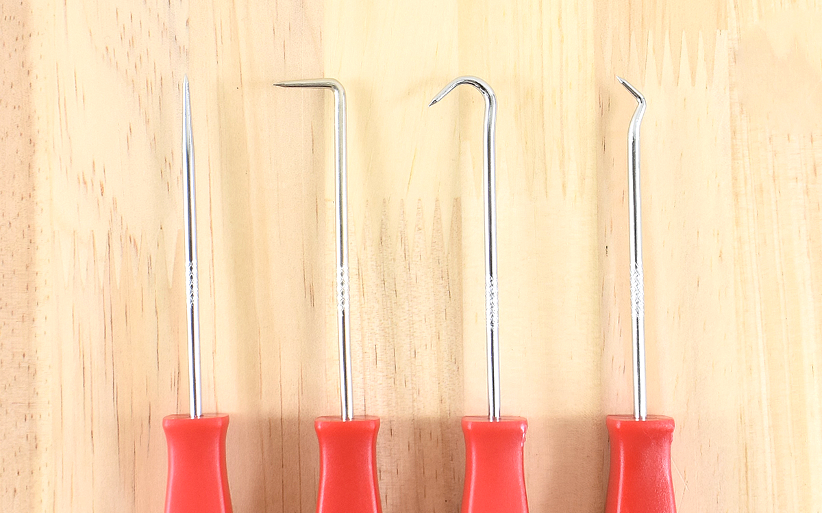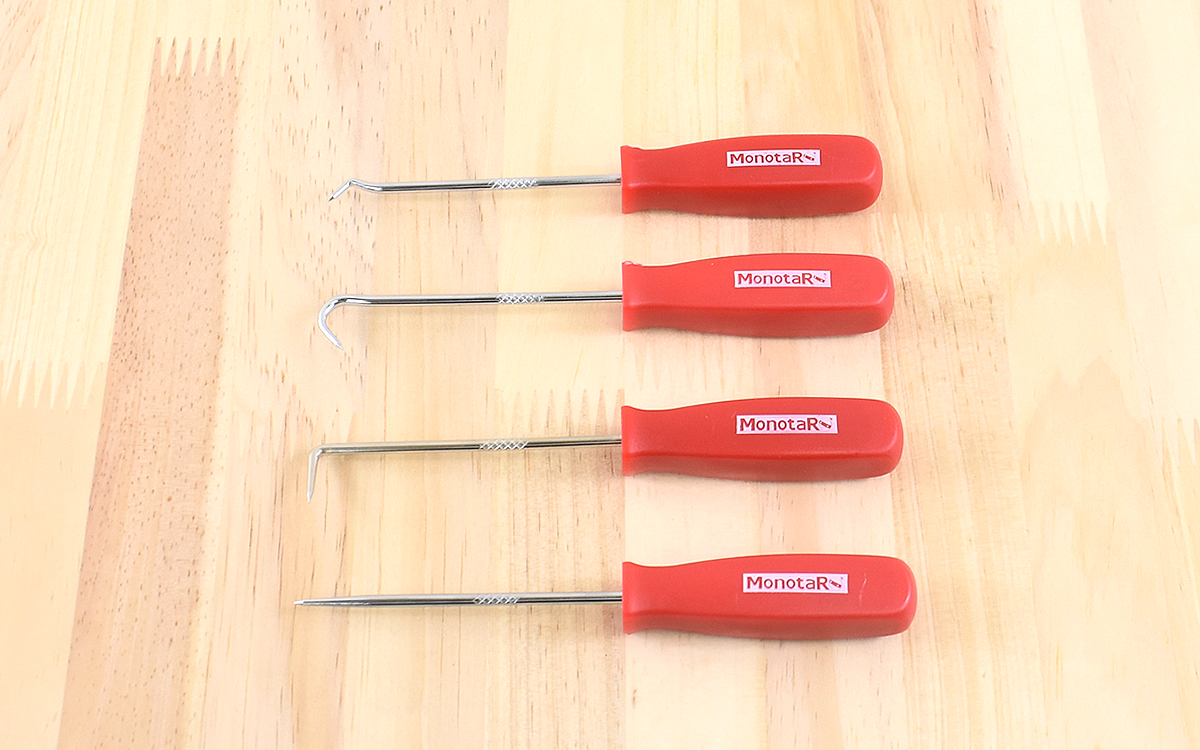 車やバイクの修理時には細かい作業が多く、Oリングを取り外す時も素手で取ろうとすると一苦労。手持ちの工具で何とか取れないかと試すものの、ちょうどいいものが見つからず時間がかかってしまうことが多々あります。無駄な時間をかけずサッと進めるために何かいい物はないかと探していたところ、「フックピック セット」(593円/税込)が目に入り購入しました。