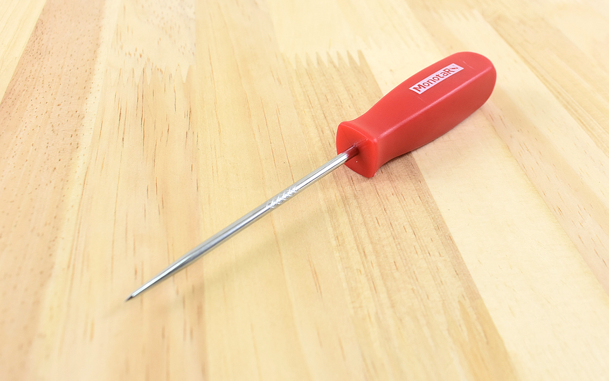 軸にはクロームバナジウムが使われていて、細くてもとてもがっしりしているので安心です。重さは約120gで、手にした印象としては軽く直感的に先端を操作しやすいのがGOOD。先端が鋭いので細かい箇所の作業にも適しています。