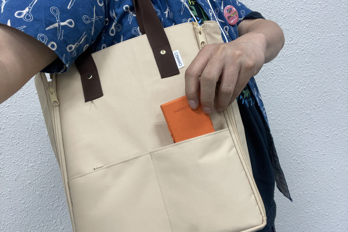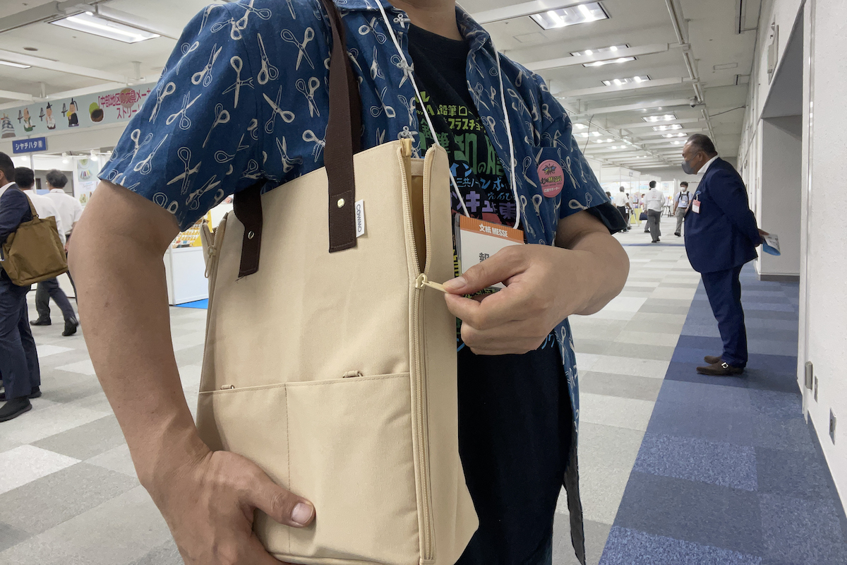 長らくのオンラインイベント続きのせいで感覚を忘れていたが、リアルでの展示会や見本市の取材では、いつもカバン選びが難しいのである。取材中は多くの出展ブースを巡るので、もらった資料やサンプルを収納したり、名刺入れを出し入れしたり……という動作を繰り返すことになるのだが、リュックだと、いちいち背中から下ろしたり上げたりが面倒なのだ。だから基本的には肩掛けのトートバッグが便利なのだが、それでも肩紐の上げ下ろしは発生するので、万全とは言い難い。