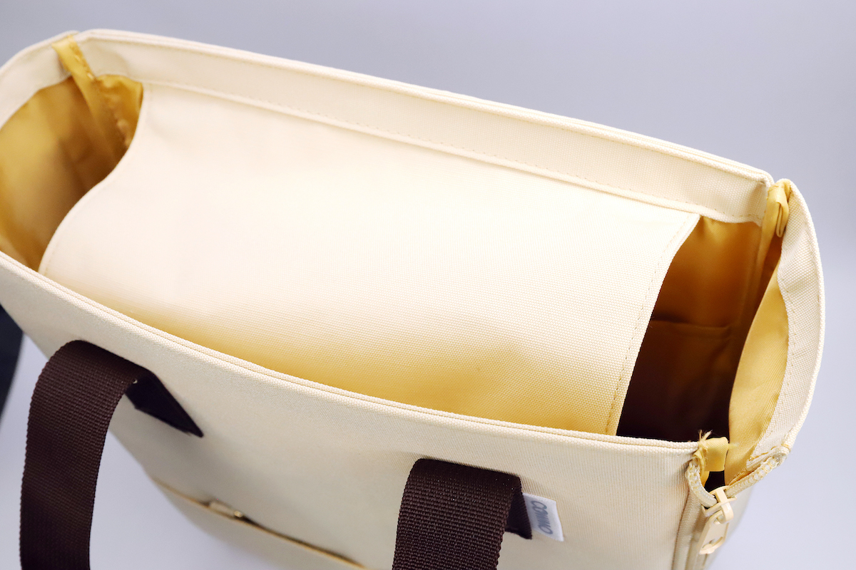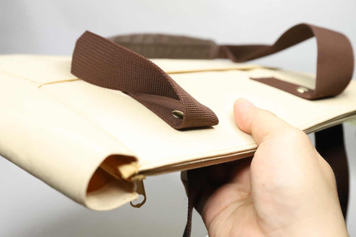 素材はかなり分厚いポリエステル生地を使っているので、頑丈さに関しては文句なし。しかもそれに加えて、表裏にそれぞれ芯材まで入っているので、安心感は半端ない。イベントや取材後に満員電車に乗っても、押されて中が潰れる心配はほぼないと言っていいだろう。