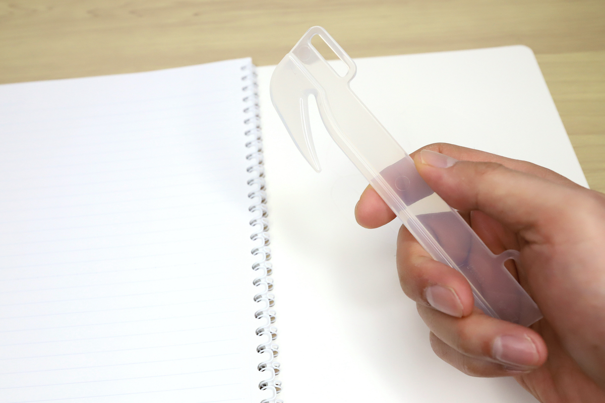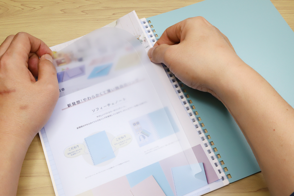 そもそも「ソフィーチェノート」は、リング自体が金属ではなく、柔らかなポリプロピレン0.2mmのシートを輪にしたもの。柔軟性があるから、束ねた紙厚より少し大きなだけのリング径で綴じられる=綴じノート並みに薄くできるというわけだ。そしてこの柔軟性と薄さによってもう一つ、リングに手が乗り上げても痛くない! という大きなメリットも生まれる。