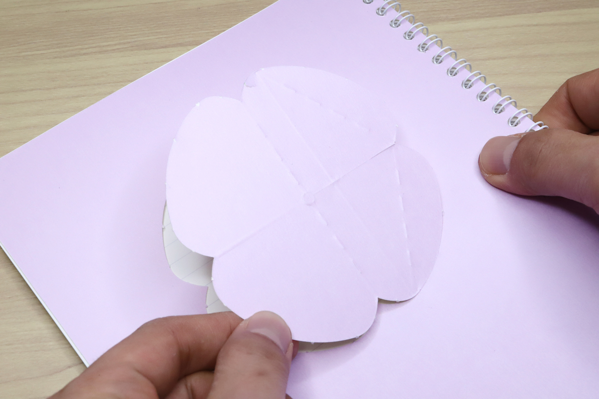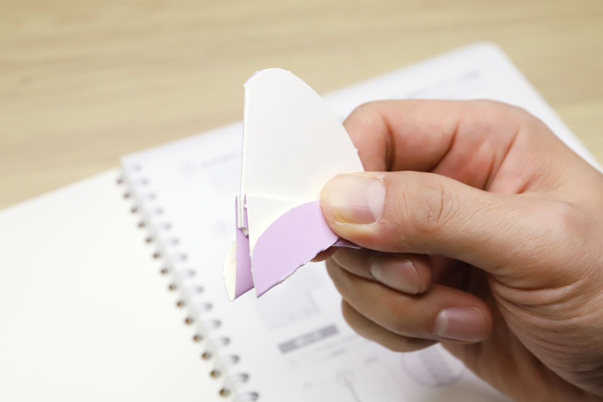 「COCOCHY」を廃棄する際には、まず裏表紙部分からミシン目に沿って、四つ葉のクローバーのような形状のパーツを切り出す。これを説明書(1ページめに付属)の通りに数回折ることで、紙製のリング分解ツールが出来上がる、という仕組みだ。