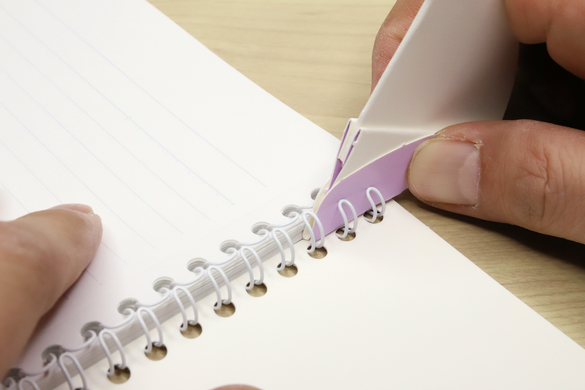 あとは先端をリングの合わせ目に差し込んでグググッと引き進めると、きれいにリングが開いて、表紙と用紙を取り出すことができる。リングは燃やせないゴミ、紙は燃やせるゴミとして分別完了だ。(もちろん、紙はツイストリングに綴じなおしても良し)