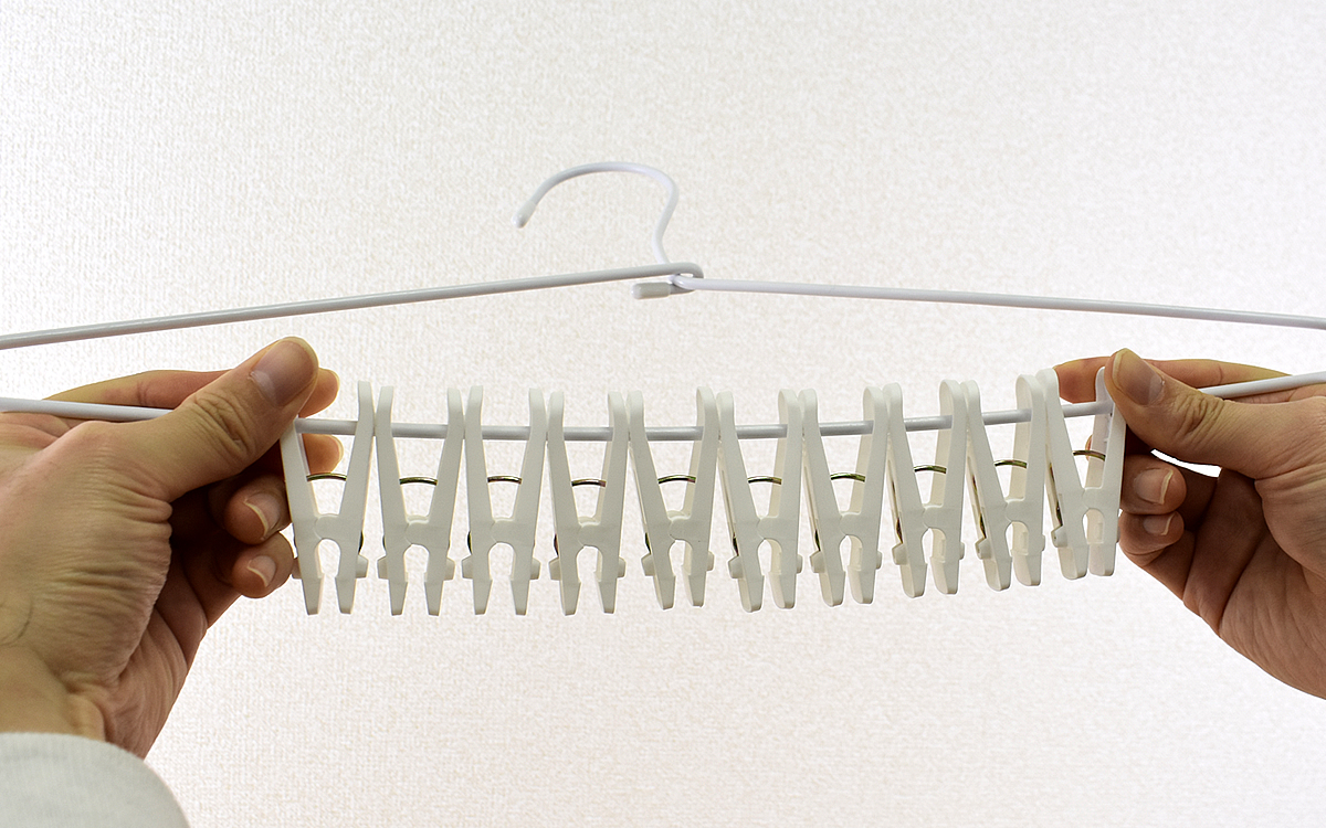 両端のピンチを持ち、中央に寄せることでピンチが開いて干したものが一度に取り込めるというまさに時短アイテム! 即決で購入してしまいました。