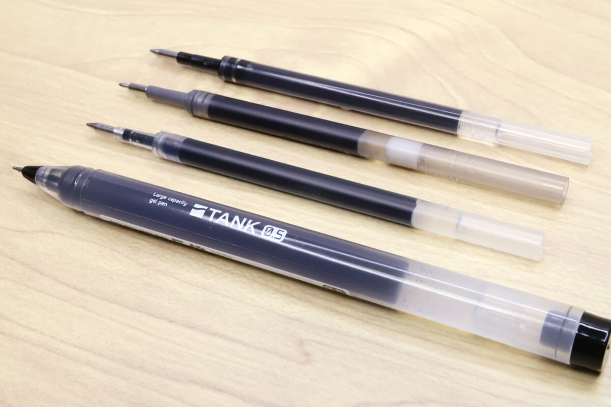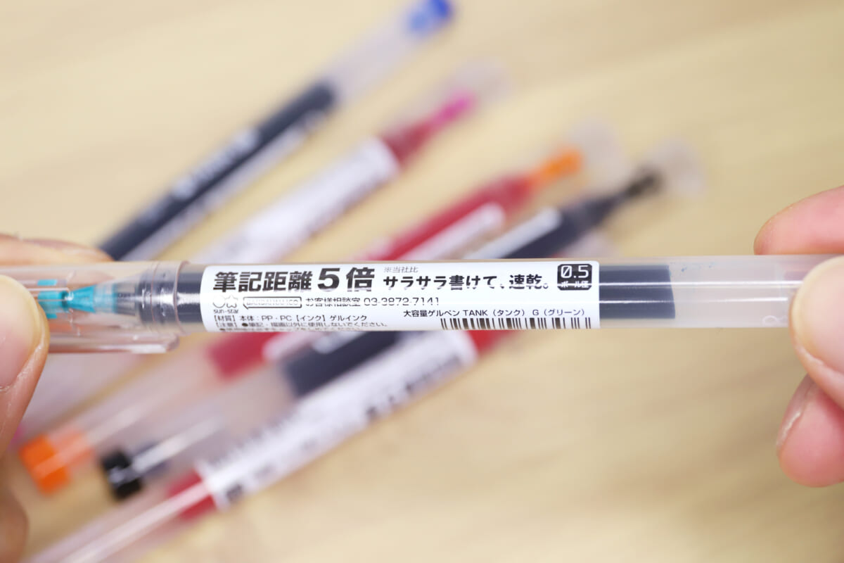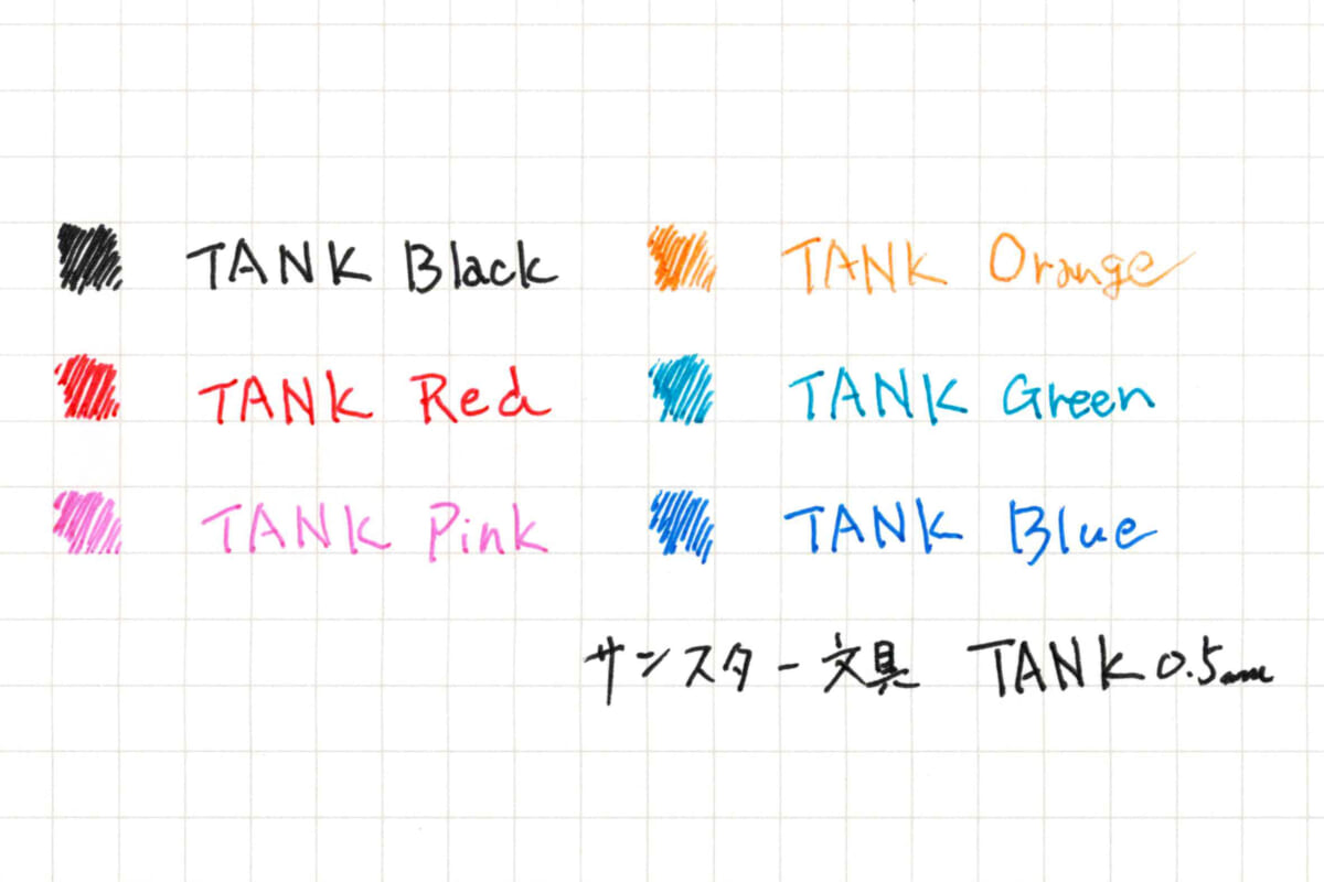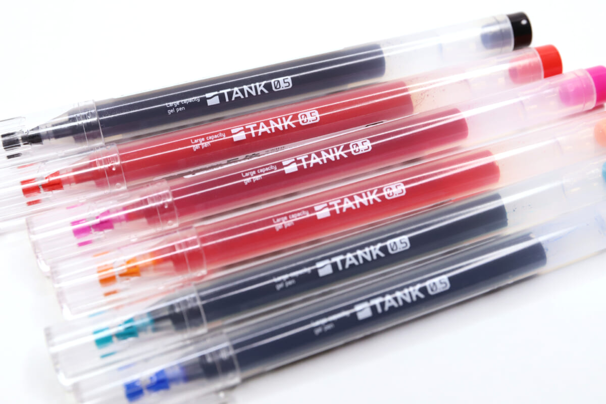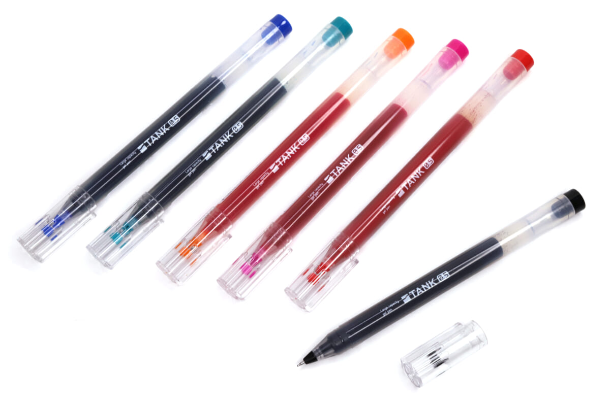 実際、インクのなめらかさや筆記のブレなさ、重心バランスなど、ペンの性能には様々な争点がある。そんな中で、もうちょいプリミティブというか、ちょっと悪い言い方をすれば “単純な分かりやすさ” を武器に登場してきたのが、サンスター文具の大容量ゲルペン「TANK」だ。