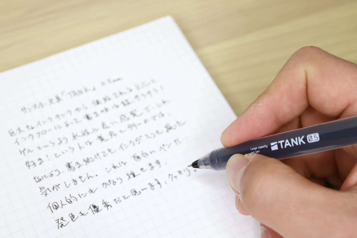 ここまでの説明だと、「TANK」は単にインクたっぷりなだけのペンだと思われるかも知れない。いや、実際そういう面が売りではある。ただ、ニードルチップから大量のインクがダクダクと出る書き味が、実はメチャクチャ筆者好みである! ということも伝えておきたい。