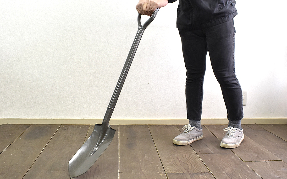さらに特徴的なのが頭部に角度がついていること。すくった土もしっかりキャッチしてくれます。水道管やガス管などのやや本格的な埋設工事に使えるのはもちろんですが、ちょっとした穴掘りや花壇など、近くに植木があってもピンポイントで土が起こせるところもオススメです。