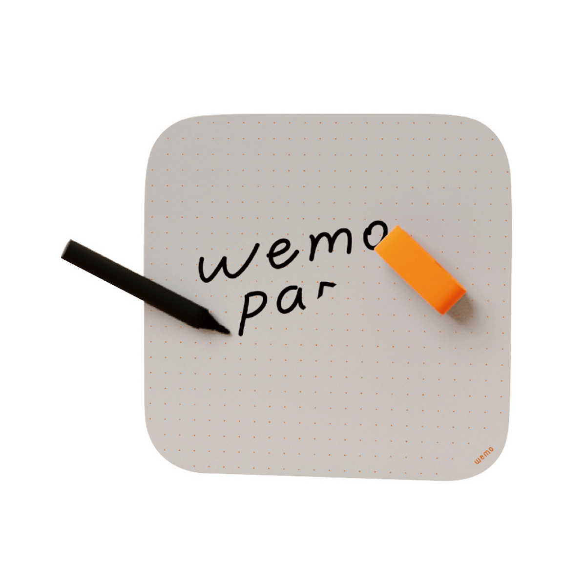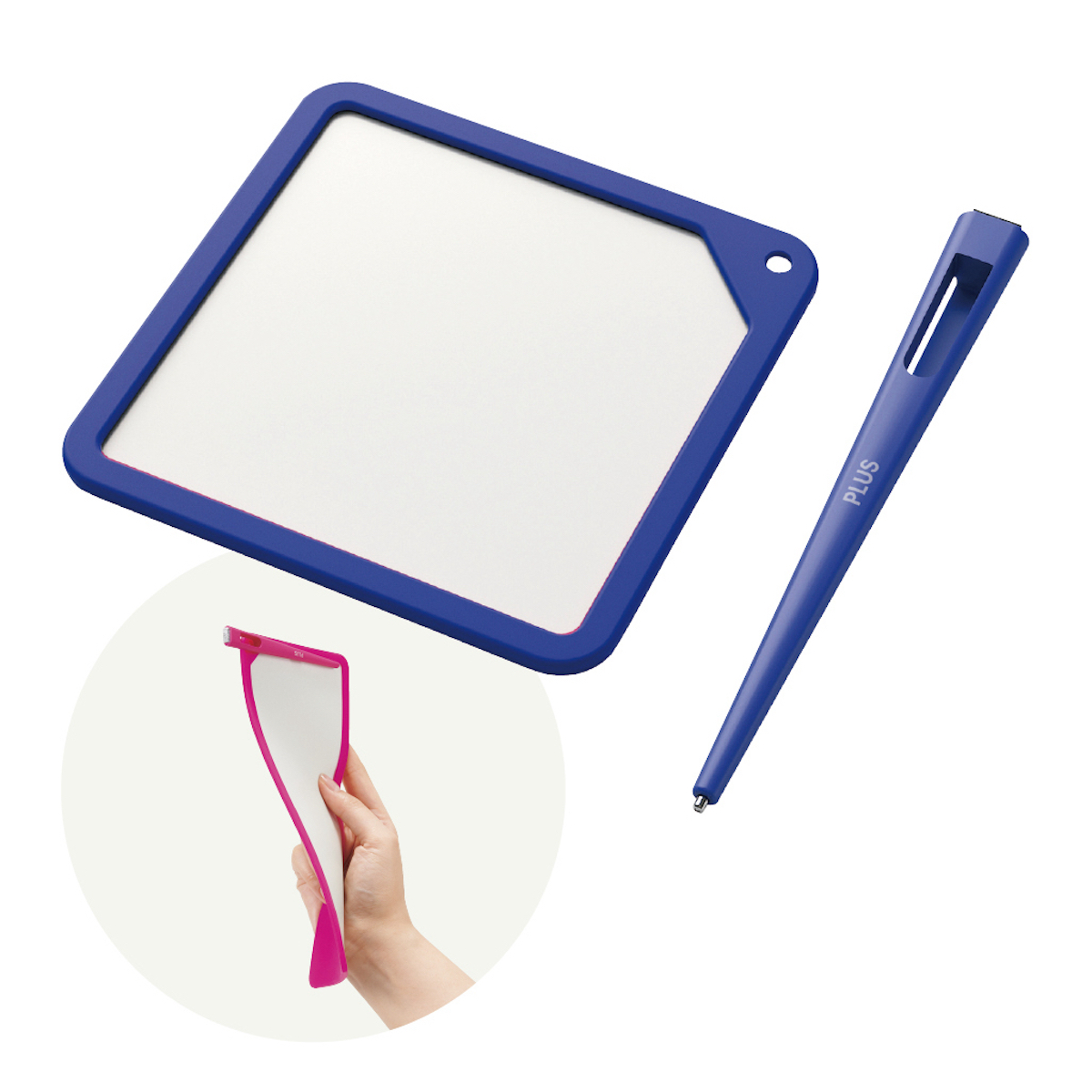 ウェブ会議の横長画面に、顔とともに写しやすい正方形のホワイトボード。パーソナルサイズで携行しやすく、会議でも手で支えやすい。ボード本体に装着可能のイレーザーはペンも収納できる一体型。