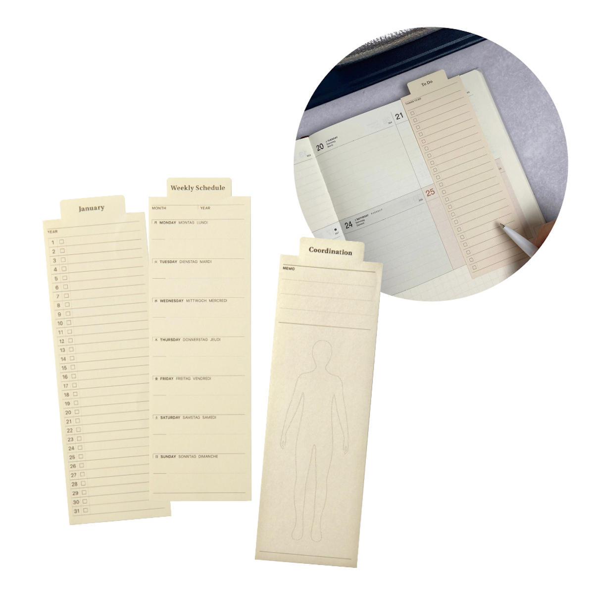 売り場の本に挟まれた短冊のようなデザインで、しおりとしてページに挟んで使えるメモ。To Doリストからコーディネートを記録できる人型テンプレートまで、メモは8種類。1セット24枚入り。