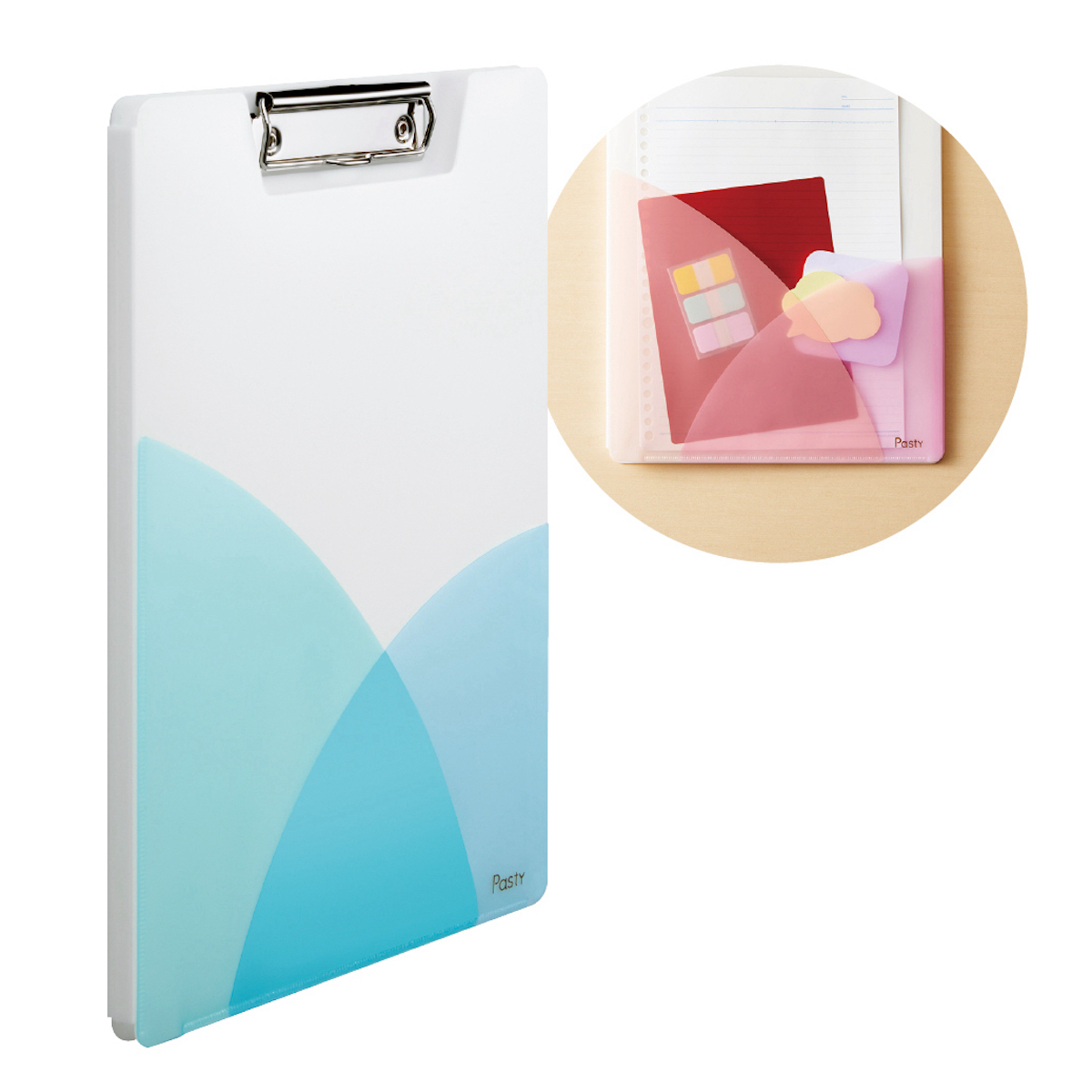 パステルカラーが持ち味のファイルシリーズに、携行に便利なクリップファイルがお目見え。付箋などの小物を収納できる表紙ポケットが付く。表紙を折り返して使えばデスクの省スペースにも役立つ。