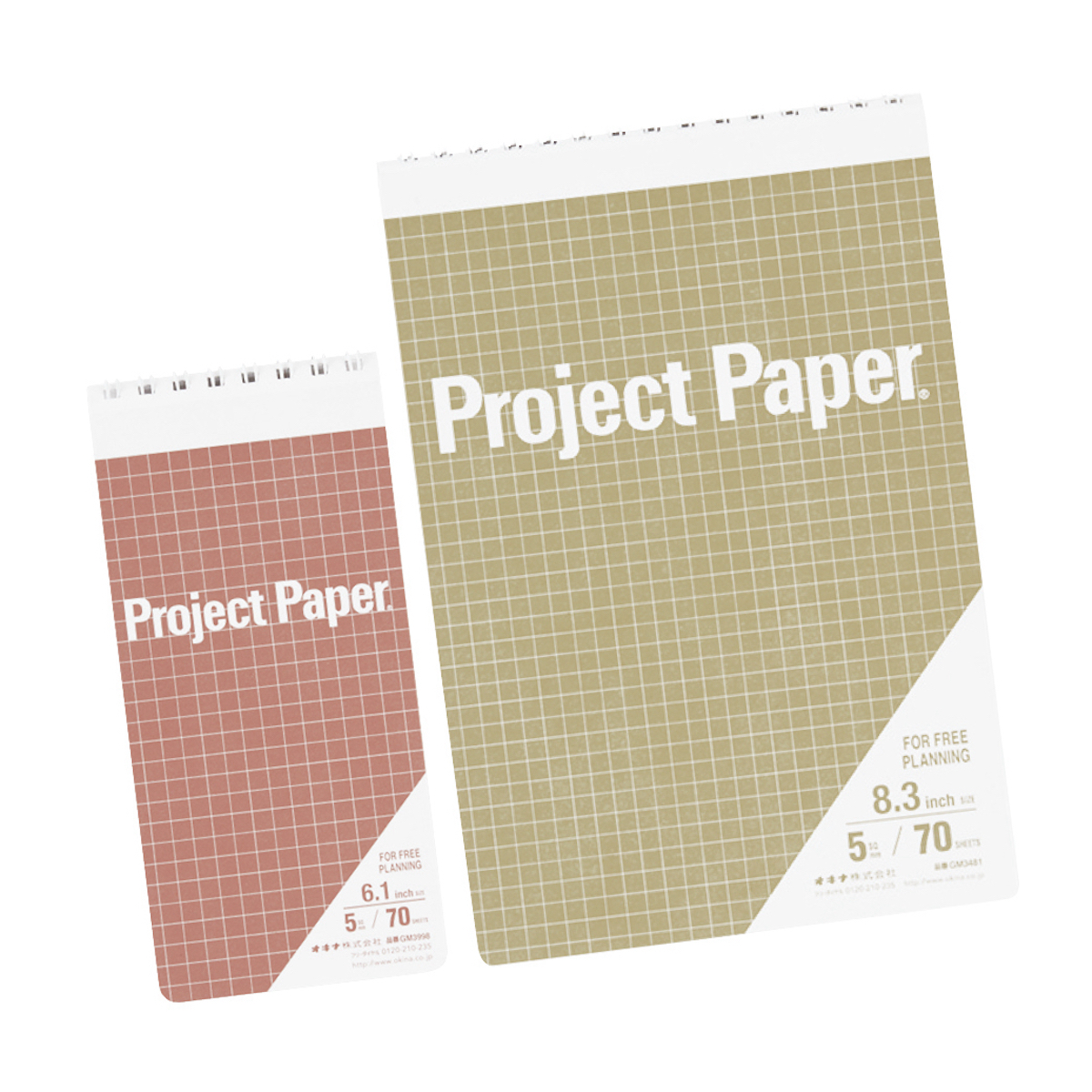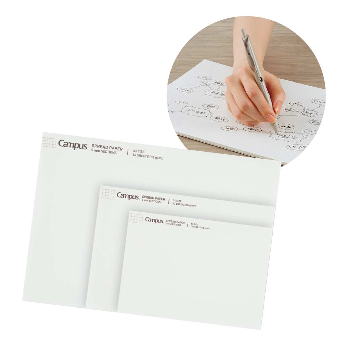 便箋にも使われる中紙で速乾性が高く、さらさらした書き心地で思考を妨げない。軽量で、表紙をぴったり折り返せるのも美点。5mm方眼罫はコピーに写りにくい薄いブルーを採用。A3・A4・B5の3種。