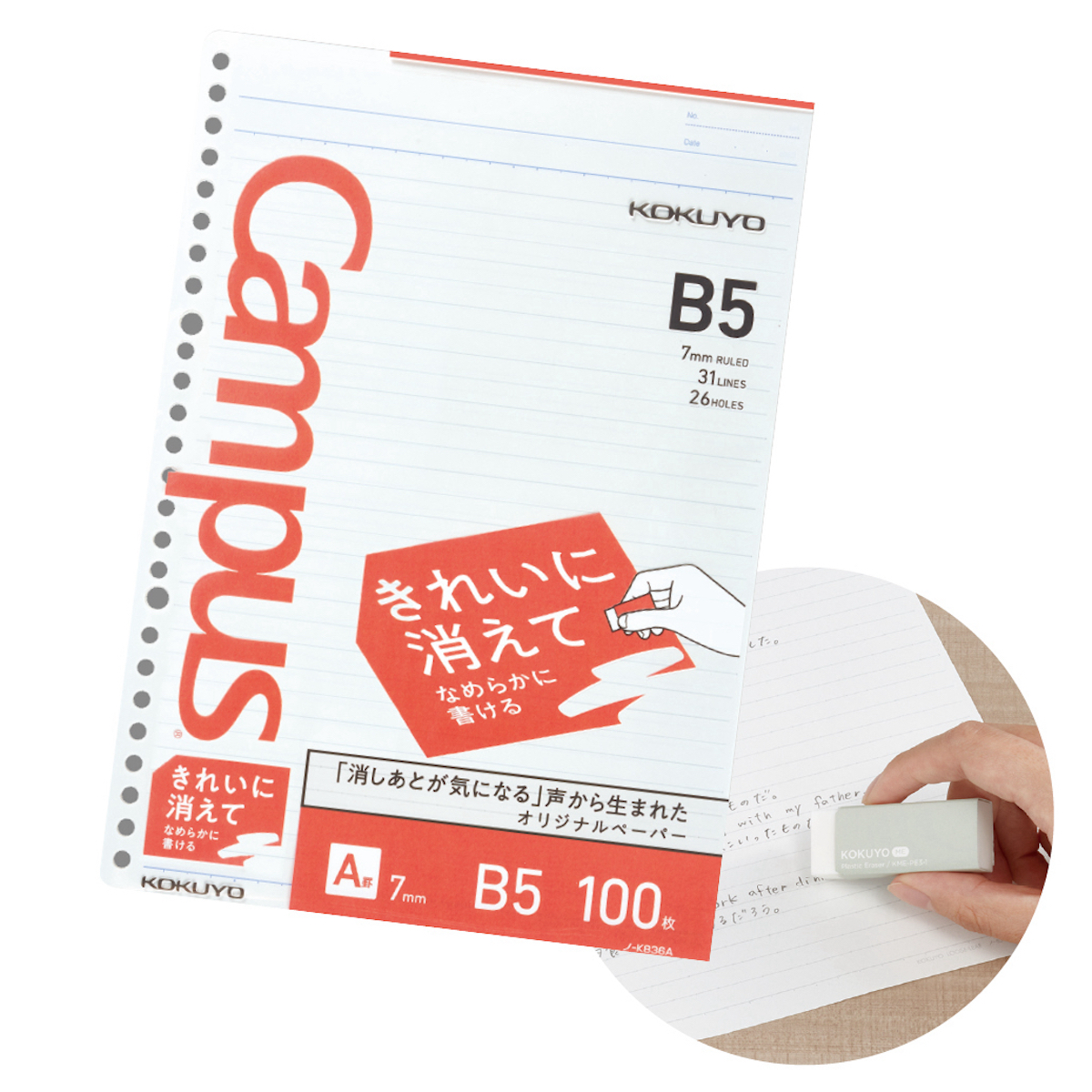 紙面の凹凸を減らして平滑にすることで、鉛筆の芯の汚れが残りにくく消しゴムによる消し跡が目立たない。軽い力で消せるので、消しゴムの摩擦による紙のシワや破れも防止。書き心地もなめらかだ。