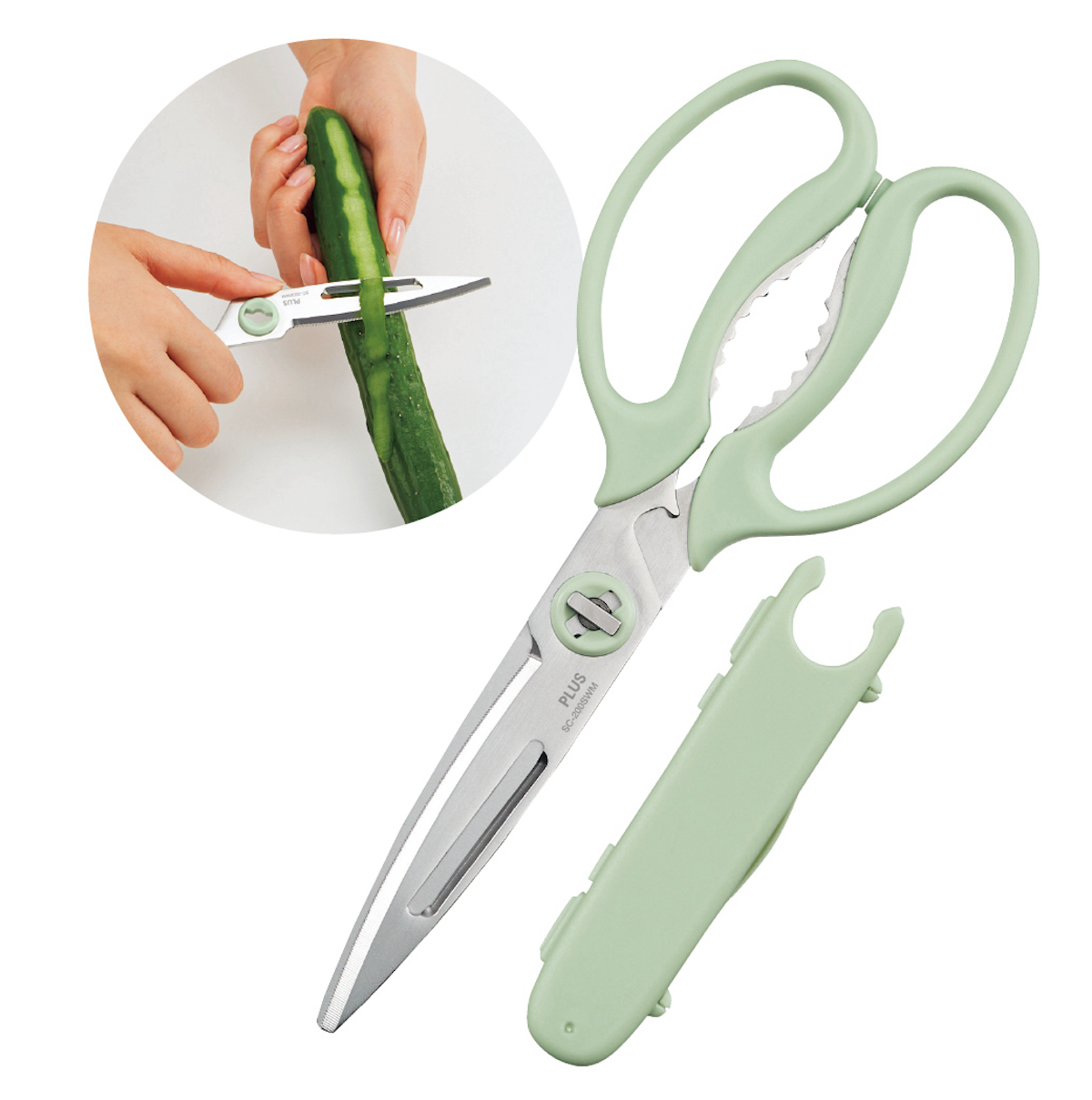 通常のカット機能はもちろん、ピーラー、栓抜き、フタ開けなどキッチンで便利な機能を1丁に集約。板厚刃とマイクロギザ刃が対象をガッチリとくわえ込むので、硬い食材もしっかり切ることができる。