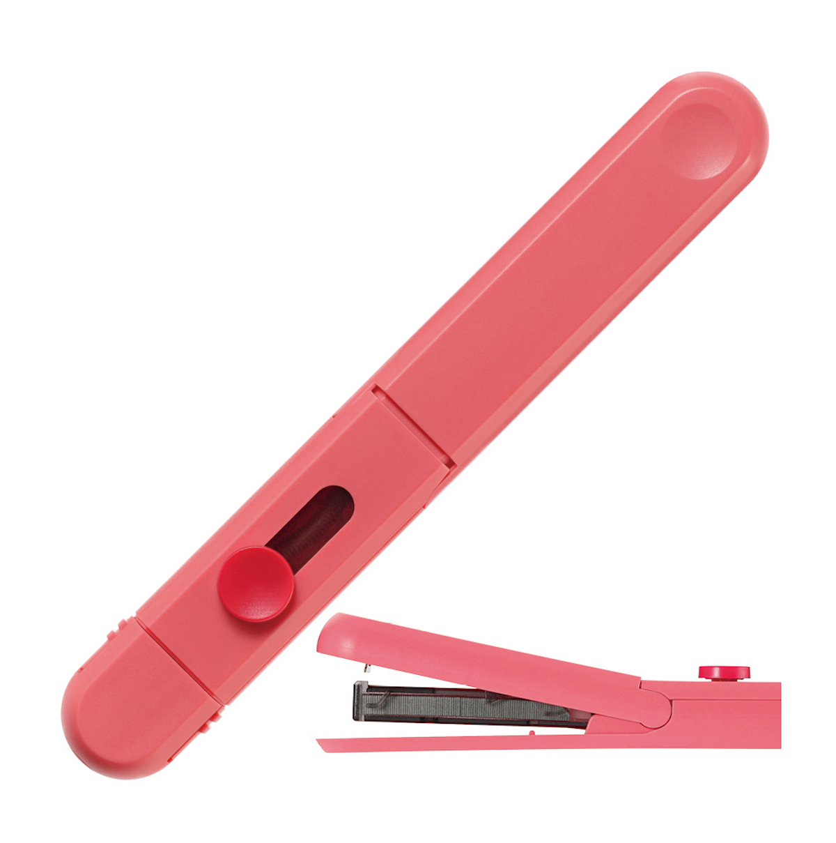 ペンケースに入れやすいスティック形状のホチキス。コンパクトながら針は最大100本と充分な量が装填でき、スケルトンで残量も確認しやすい。ボタンをスライドするだけのワンアクションで済み、片手で簡単に操作可能。