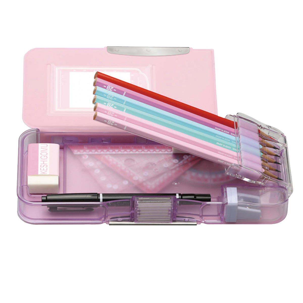 筆入を開けたら、鉛筆が全部削れてない……あの絶望感を防止する、先端だけが透明になった筆入。ひと目で削り忘れや入れ忘れのチェックができ、取り外せる鉛筆削りも付属する。全5色。
