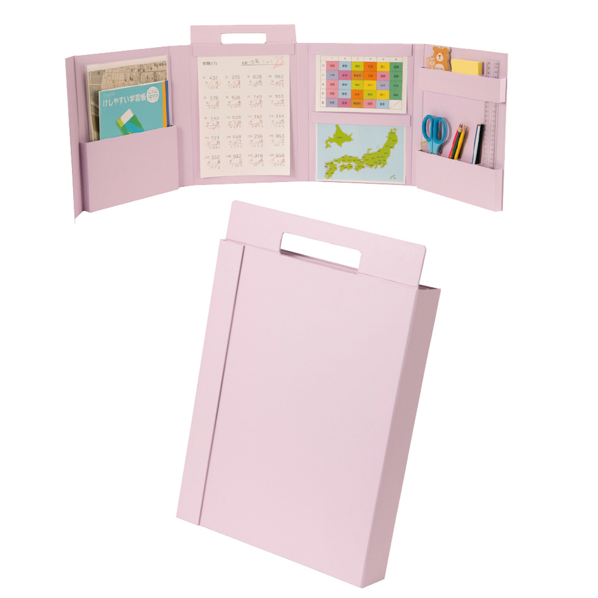 ダイニングテーブル等に広げて自分だけの学習スペースが作れる、気軽に導入しやすい紙製パーテーション。ペンやノートを収納、時間割なども貼り付け可能。片付けるときは閉じるだけ。全2色。