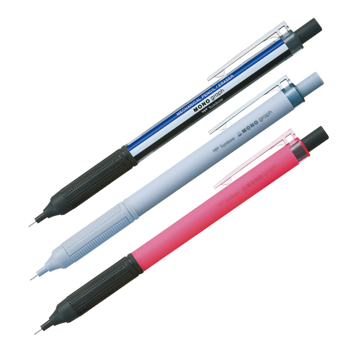 回転繰り出し式のモノ消しゴム付き、高視界ロングパイプによる高精度で狙った位置へ確実に筆記。滑りにくい高密度テクスチャーグリップも、ベタつきを抑えた快適な握り心地。芯径0.5mm。全7色。