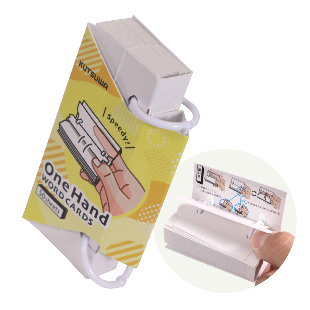 表紙ポケットに人差し指を入れ、切り欠きに親指を入れてめくる独自の構造によって片手で使える単語カード。右手・左手どちらでも使用でき、電車やバスで吊り革につかまりながら暗記ができる。大小各4色。