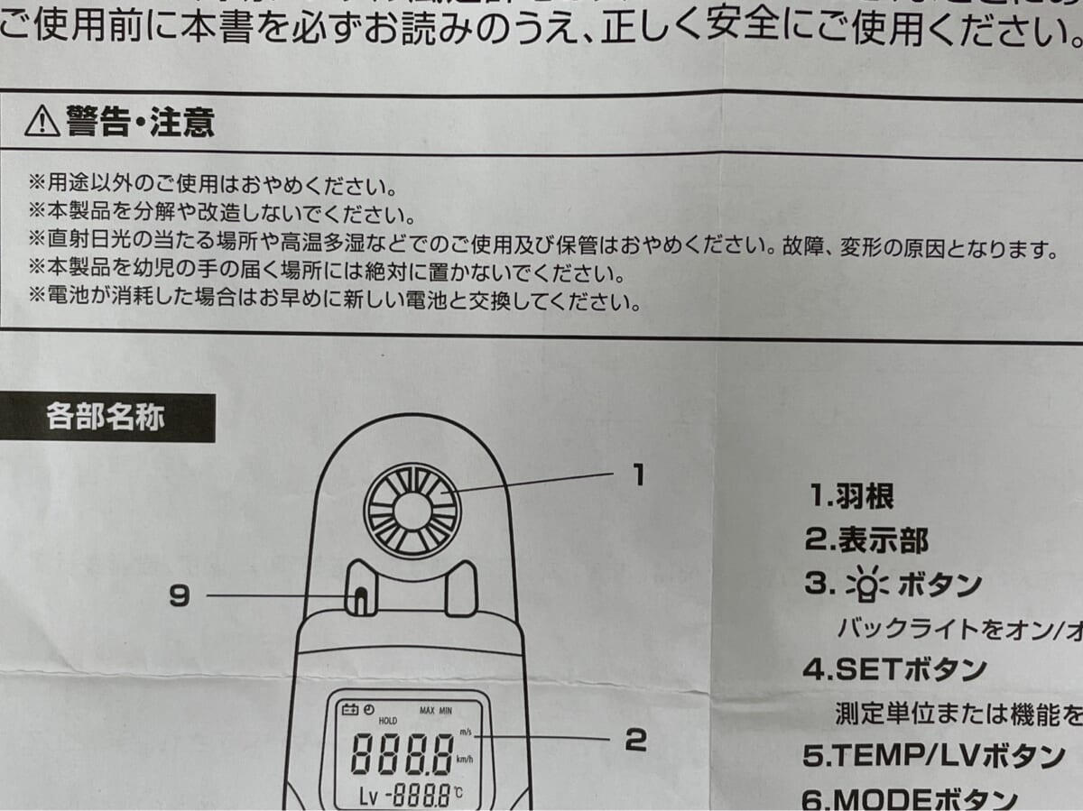青色の電球マークボタンでバックライトがつくため、暗所で数値が見えにくい時の計測に役立ちます。簡易とはいえ風速はモード設定でメートル/秒と、キロメートル/時の切り替えができ、通常動作モード時に「TEMP/LV」ボタンを押すと温度測定(℃)と風力測定(Lv)の切り替えも可能。風がやむと風速値は0になりますが、「HOLD」機能で風がやんでも数値を固定しておけるのが便利です。