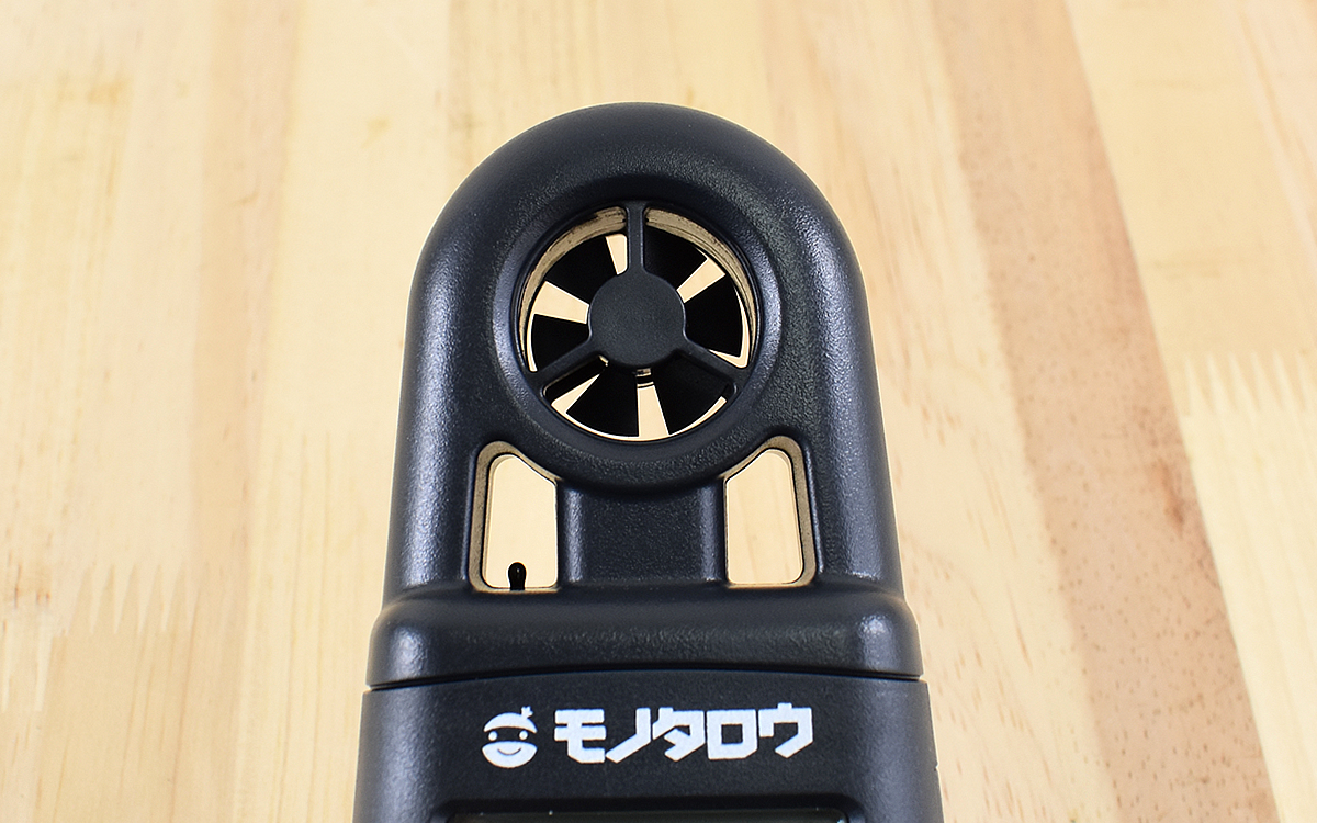 頭には風をキャッチする羽根がついていて、その左下にある小さな突起が温度センサーです。羽根が回転すると設定に従って風速や温度が表示されるので、使用時は本体の後方から風が当たるように保持してください。