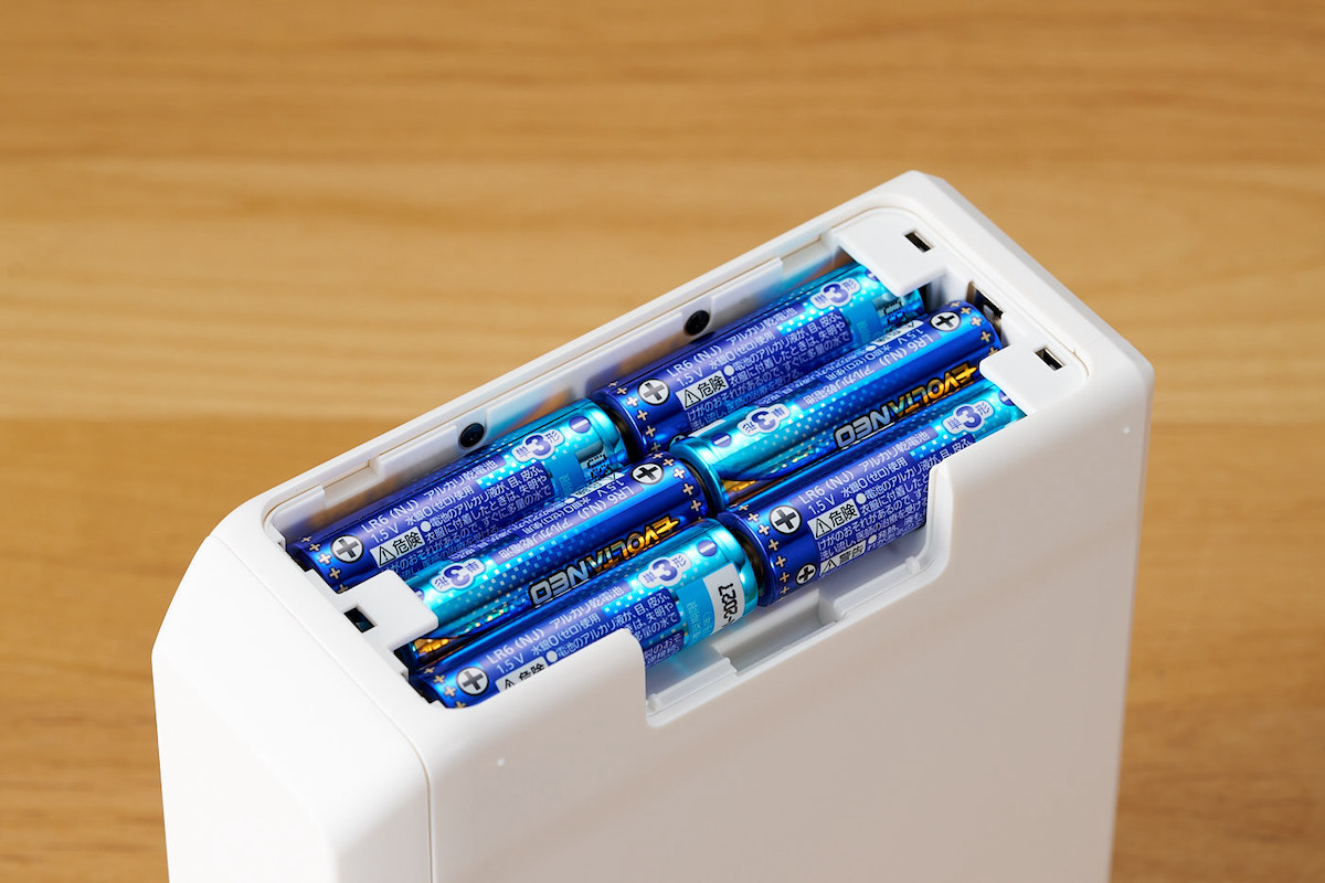 本体サイズは約幅134×厚み54×高さ145mmで、上の写真で確認できるように “MARK” とほぼ同じサイズ。別売りの単三形の乾電池か充電池6本で駆動する。ACアダプタがないので部屋のなかでのちょっとした持ち運びも簡単だ。