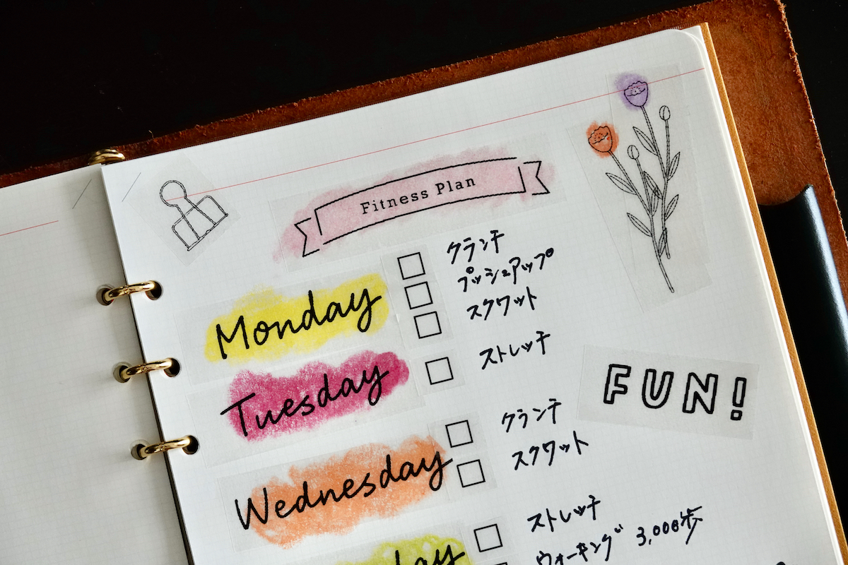 「Hello」は、趣味や日々のトレーニングを記録するためのテンプレートも豊富。手書き調にデザインされた日付やキーワードのフォントを組み合わせれば、イラストが苦手なユーザーでもおしゃれにデコれるので、記録すること自体が楽しくなりそうだ。