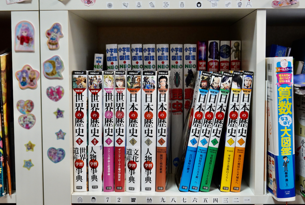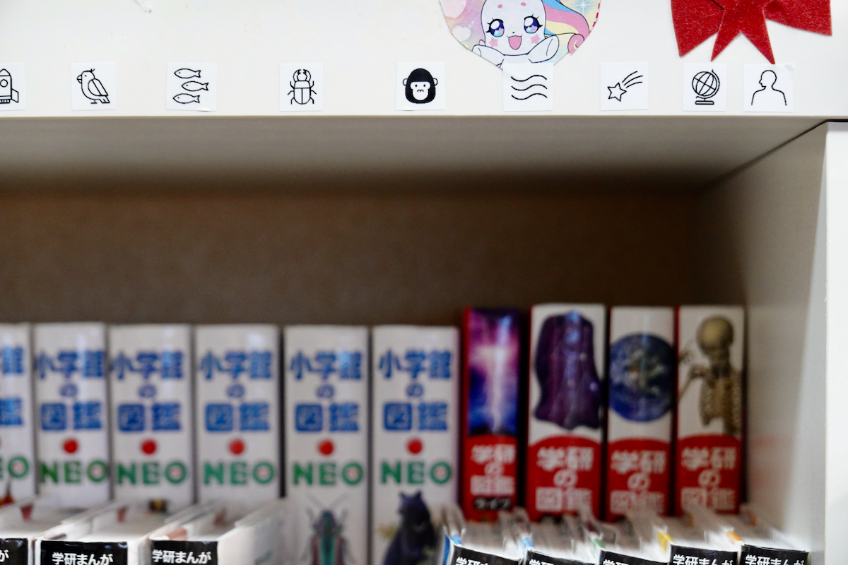 家に子どもがいる場合は、忘れ物防止や片付けに「SR-R2500P」と「Hello」が味方してくれる。例えば、いつのまにか散逸してしまう図鑑。しかも全巻が揃っていない場合はますます行方不明になりやすいが、分厚いので比較的定位置も決めやすい。テキスト編集で数字ラベルを作ったり、Helloにアップされた絵文字を使ったりして、マーキングしてあげると片付けがはかどる。