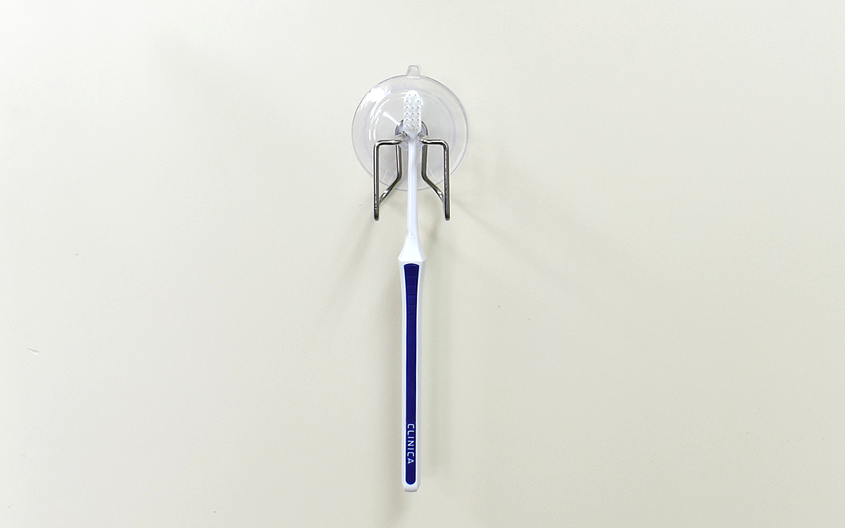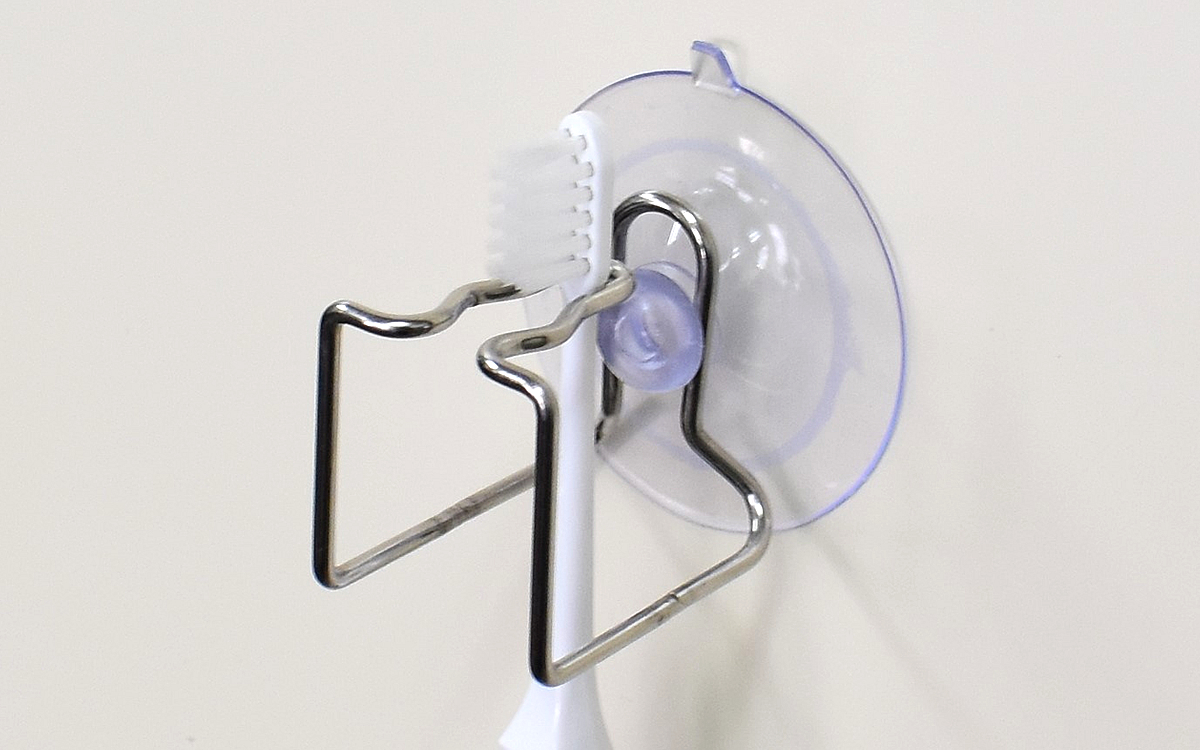 歯ブラシを置く時はステンレスのネック部分に首をかけておくスタイル。またステンレスは途中で変形して幅が広くなっているため、多少幅のあるアイテムでも引っかけられます。