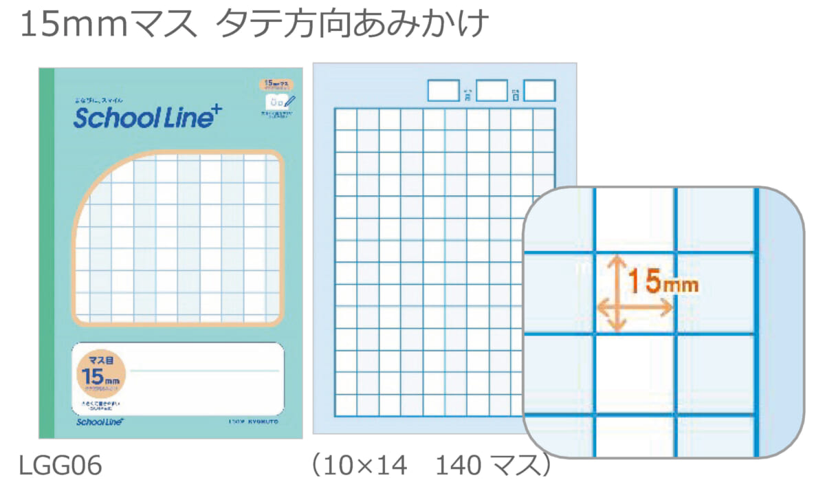今回発売となるのは、「LGG01 マス目 大 書字練習用50mmマス」「LGG01R マス目 大 書字練習用50mmマス 中心リーダー入」「LGG02 マス目 小 書字練習用25mmマス」「LGG02R マス目 小 書字練習用25mmマス 中心リーダー入」「LGG03R 漢字練習 大 35mmマス 中心リーダー入」「LGG04R 漢字練習 小 24mmマス 中心リーダー入」「LGG05 横開マス目 22mmマス タテ方向あみかけ」「LGG06 マス目 15mmマス タテ方向あみかけ」「LGG07 れんらくちょう タテ9行マス目 中心リーダー入」「LGGF4 英習罫 4段 あみかけ 小文字が大きく書ける」の10種類で、価格はいずれも230円(税別)です。