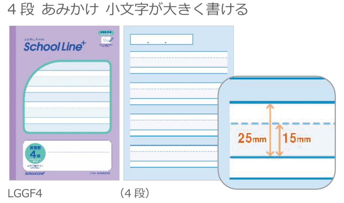 従来の学習帳よりも、文字を大きく書けるように設計されているのが特徴で、罫線を太く筆記部分を白抜きにすることで、一目見てどこに文字を書くのかが分かるよう工夫しており、まだしっかり鉛筆を握れない子どもの“はじめての文字練習のノート”としても利用できます。手先が器用でない子どもでも使えるような、ユニバーサルデザインの学習ノートとして作られています。
