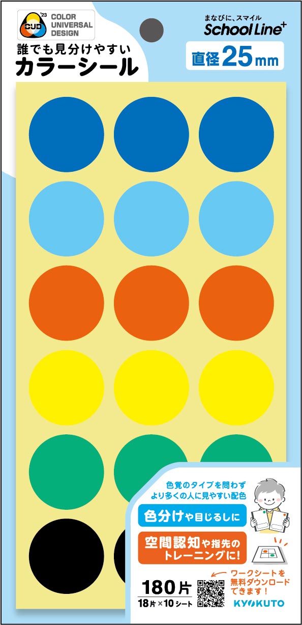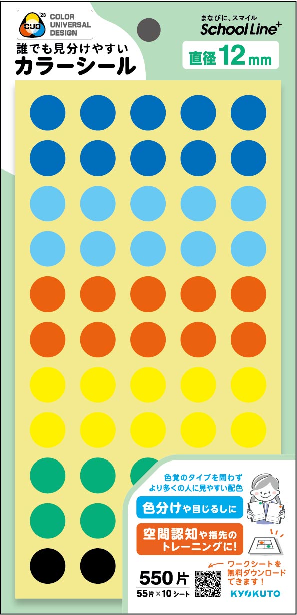 同製品は色覚の多様性に配慮し、NPO法人カラーユニバーサルデザイン機構の協力を得て「カラーユニバーサルデザイン推奨配色セット制作委員会」の色彩値を反映しています。色覚のタイプを問わず、誰もが公平に見える配色のアソートのシールで、教室や事務室、図書館など、様々な場所で“識別用のカラーラベル”としても使用できます。
