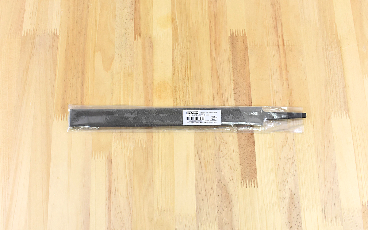 モノタロウ公式サイトで購入する際には、ヤスリの長さや目の粗さ、幅、全長をお好みで選択可能。今回は目の粗さは中目、サイズは全長370mm、ヤスリの長さ300mm、幅27.2mmの一番大きいサイズを購入しました。透明のビニール袋に入った状態で届いた商品を手に持ってみると、見た目以上にずしりとした重みを感じます。