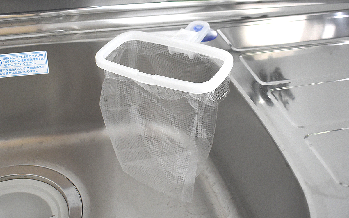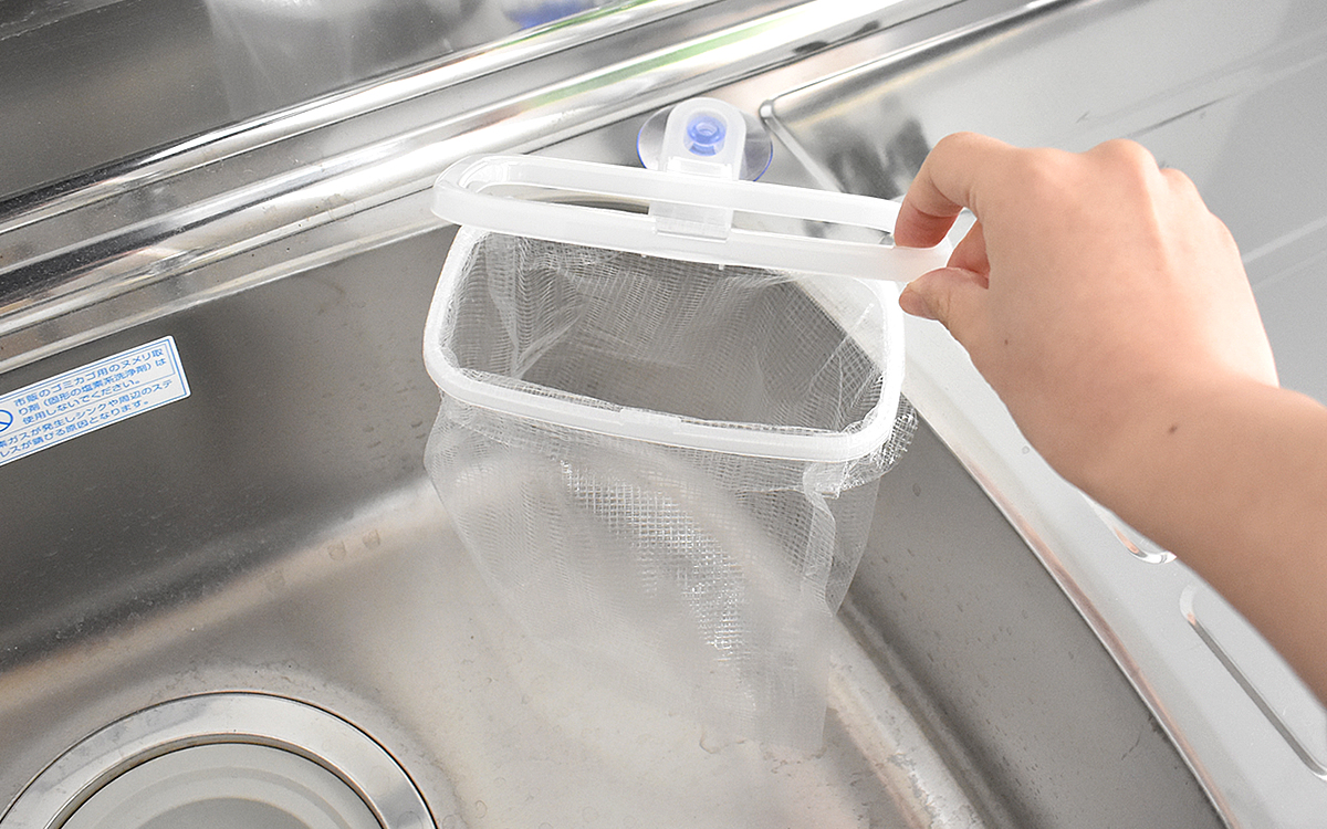 本体はポリプロピレン製の白いカラーに、5.8(幅)×3(奥行)×18cm(高さ)とコンパクトなサイズ感。シンプルな見た目はごちゃつきやすいキッチンでも悪目立ちしません。また吸盤の力が強く、しっかりとシンクにくっつくのでストレスなく使用できそう。ちなみに使用には20cm幅以上の別売の水切りゴミ袋が必要です。