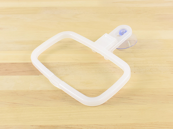 シンクの角に吸盤を使って取りつけるタイプのゴミ袋ホルダーで、三角コーナーのように場所を取らないシンプルですっきりしたデザインです。