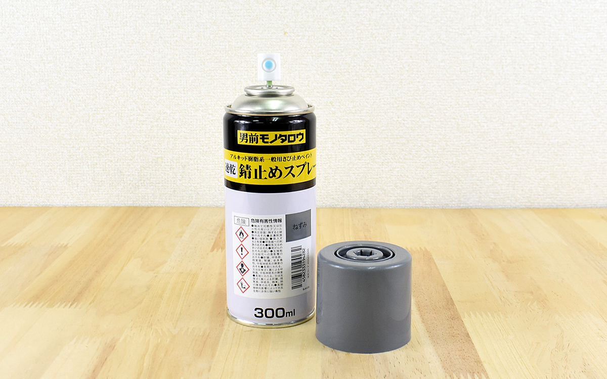 ラッカーや水性・油性塗料の上塗りができる上に、わずか30分の速乾性なので作業が捗りそうです。カラーは「あかさび色」と「ねずみ色」の2色がありましたが、今回はねずみ色を選びました。キャップの色がスプレーカラーを表しているので視認しやすいですよ。