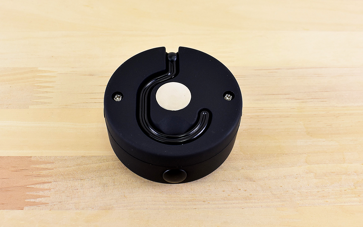 商品サイズは、約69(直径)×37mm(奥行)。重さは62gと非常に軽いです。裏面にはフックとマグネットが付いていますが、フックは収納できるので見た目もスッキリしています。電池を入れるときにはプラスドライバーが必要でした。単4形電池3本を使用しますが、こちらは別売りなので用意しておきましょう。