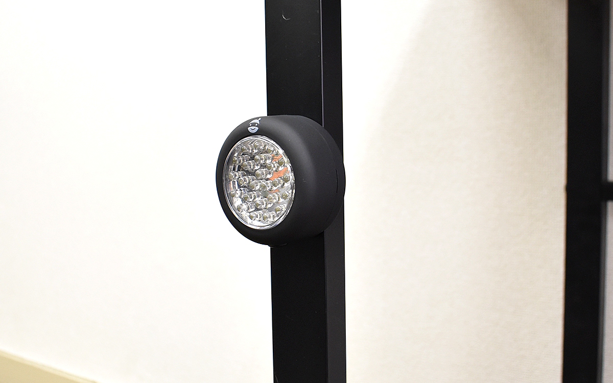 試しに金属製ラックに取り付けてみたところ、ビタッとくっついてくれました。安定感があり、ズリ落ちてくる様子もありません。フックとマグネットが用意されているので大抵の所には取り付けられますね。暗い中での作業用のほか、ベッドサイドなどにもオススメです。