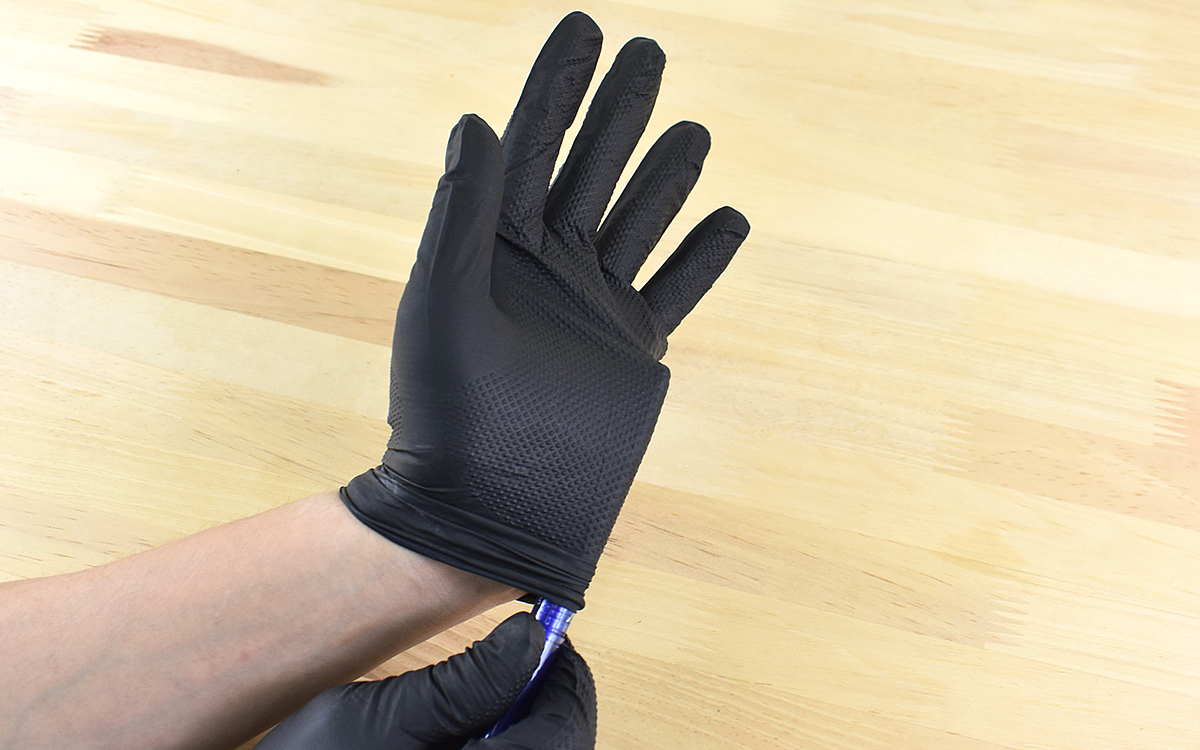 実際に装着してみるとフィット感は抜群。手首から指先までしっかりとゴム手袋をはめた感覚を得られます。装着した状態でも伸縮性があるため、ゴワゴワ感のない自然な着け心地でした。