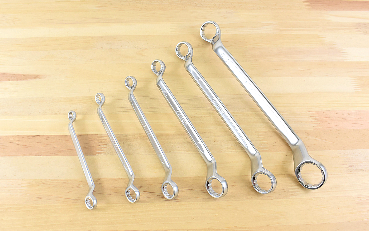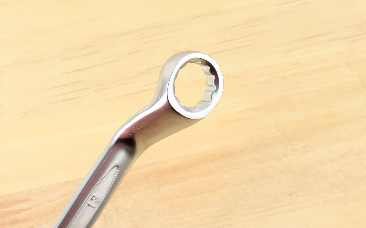 レンチの最小径は約8×10mmで、それ以外は約10×12、11×13、14×17、17×19、22×24mmのサイズとなっています。クロバナジウム鋼製のレンチは1本1本が頑丈でチープ感はありません。