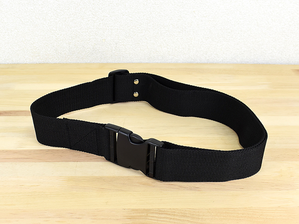 ポリプロピレン製のベルトとプラスチック製のバックルで構成されたシンプルなデザインの同商品。商品のサイズは約1300(長さ)×3(ベルト厚)×50mm(ベルト部)。バックル部分が60mmあるので、手持ちの腰袋がある場合は購入前に通るかの確認をしてくださいね。