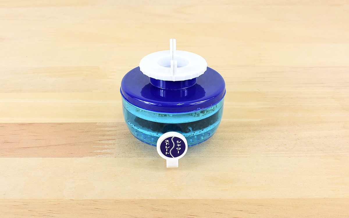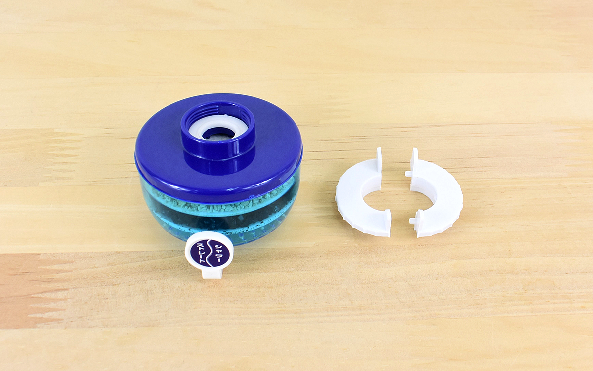 有効期限が約2カ月の使い切りタイプの同商品。サイズは約6(直径)×5.5cm(高さ)とコンパクトで、シンクも広々使えます。使用されているろ過材は、重金属などを除去できるゼオライト天然石と塩素などを除去できるヤシ殻活性炭の2種類。そして不織布フィルターが鉄サビなどをしっかり取り除いてくれます。