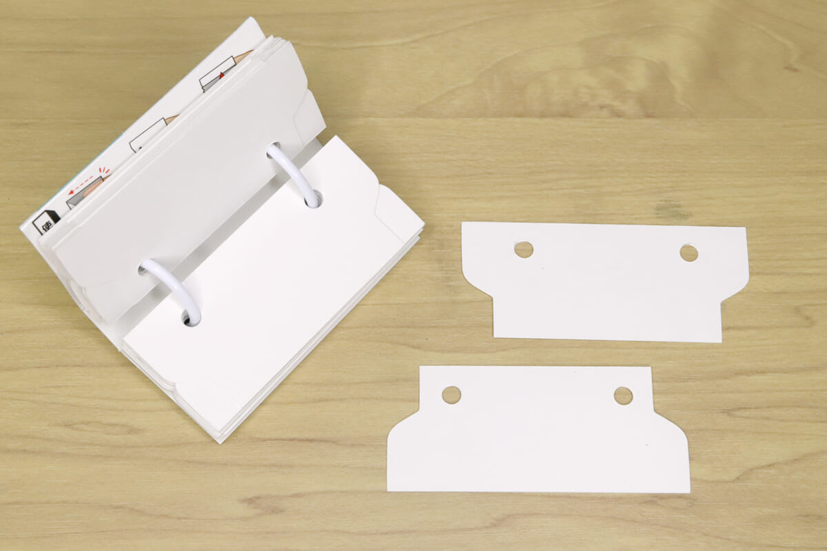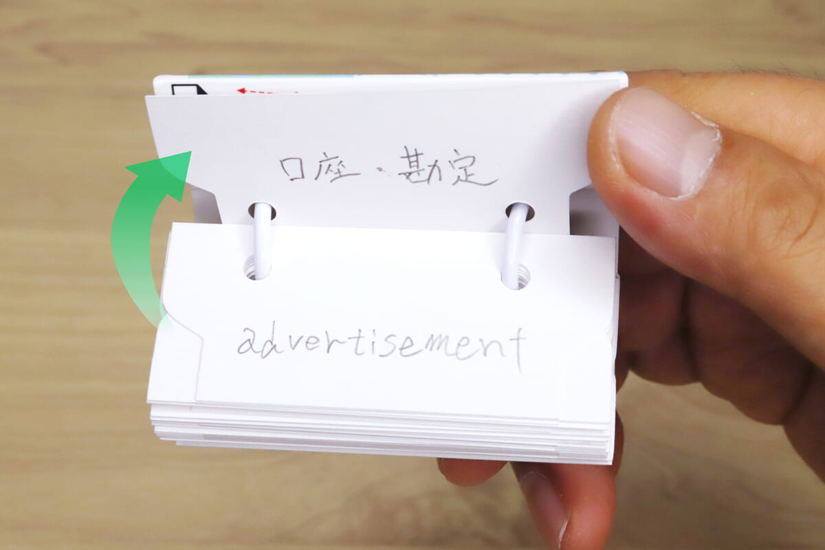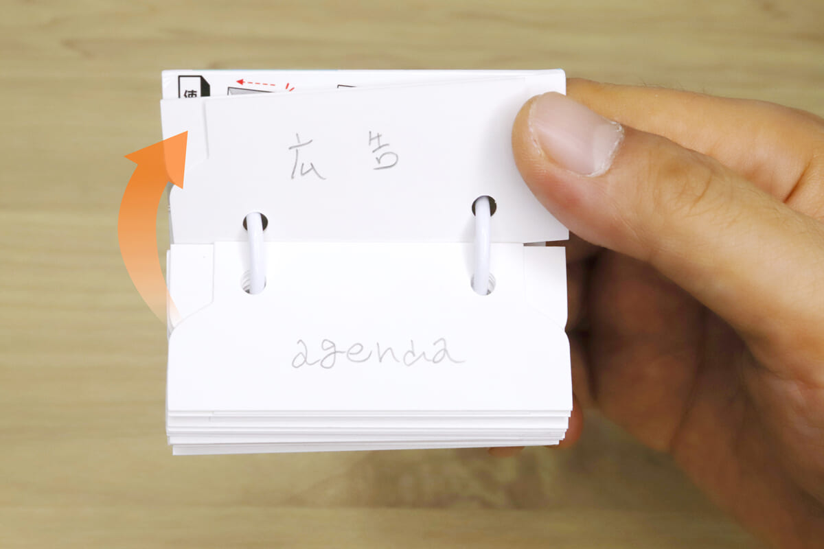 ところが「ワンハンド単語カード」をめくる場合は、表紙のスリットに人差し指を挿し込んだら、親指をカードの切り欠きから下に潜り込ませて、スイッと持ち上げるだけ。しかもリング2本でカードを綴じているので、片手……というか指二本だけで、驚くほど安定してスピーディーにめくることができるのだ。