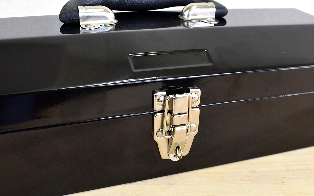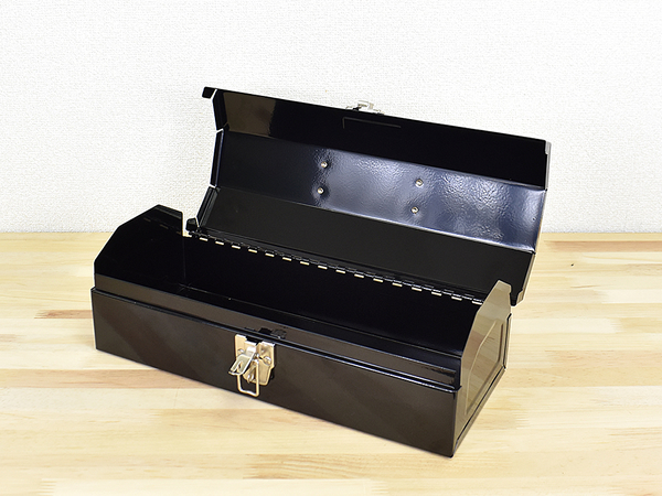 ロゴや刻印は一切なく、黒一色のシンプルなデザイン。一般的な形状の工具箱ではありますが、シックな色合いなのでインテリアとしても悪目立ちしないのがGOODですね。また、外寸は361(幅)×115(高さ)×167mm(奥行)と横長な作り。スチール製ということもあり、手に持つと相応の重みを感じました。