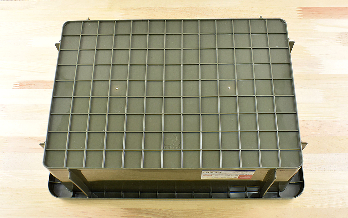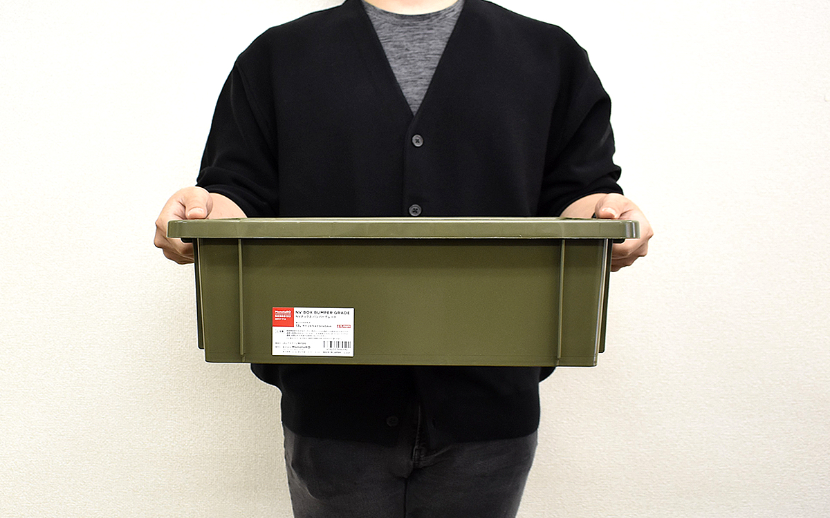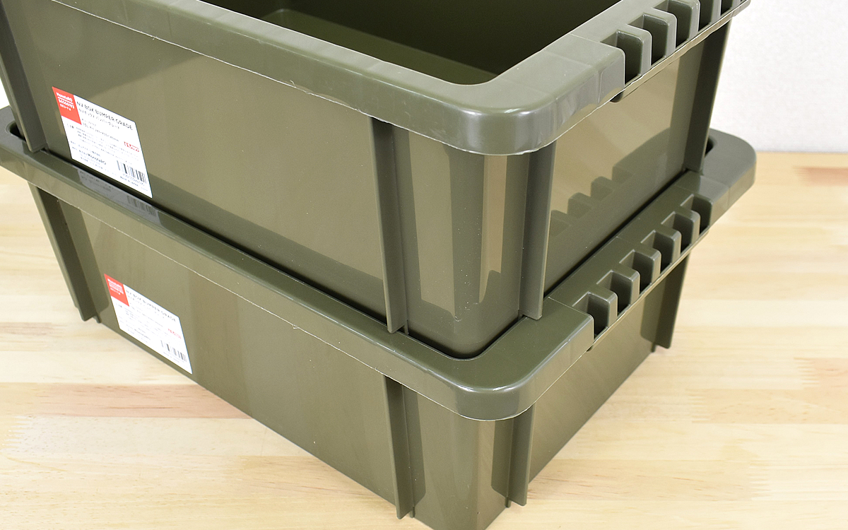 生活用品・大工道具・アウトドア用品などの運搬や保管に便利で、スタッキングもできる万能なコンテナボックス。特に惹かれたポイントはなんといってもカラーリングです。オリーブドラブというミリタリー調のカラーリングは、目立ちすぎない落ち着いた雰囲気があり、キャンプグッズやインテリアにも馴染みやすそう。
