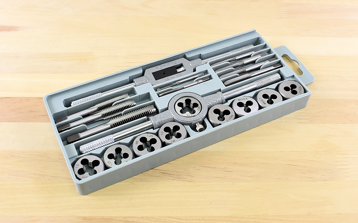 セット内容は、ハンドタップ9本・ダイス9個・タップハンドル1個・ダイスハンドル1個の計20点。これらが全て約23.5(幅)×10.5(奥行)×2cm(高さ)の専用ケースに収納されています。タップとダイスのサイズはそれぞれM3×0.5~M12×1.75まであり、各パーツにそれぞれのサイズが刻まれているので使うときにも迷いません。