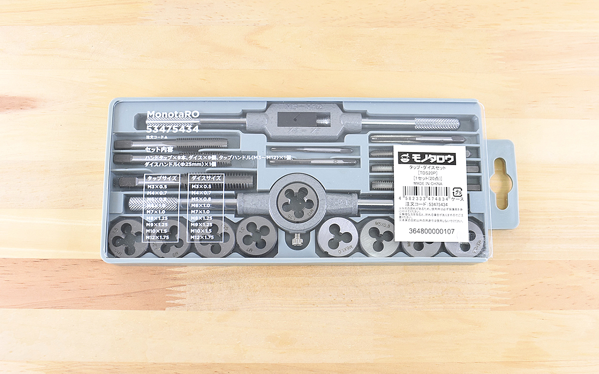 作業工具から電動工具まで、さまざまな工具用品が低価格で手に入るモノタロウ。「タップ・ダイスセット」は、使用頻度の高いサイズのタップとダイスを集めた便利なセットです。タップハンドルとダイスハンドルも付属しているので、このセットがあればねじ切り加工やネジ山修正が手軽におこなえます。実際の使い方や使用感を見ていきましょう。